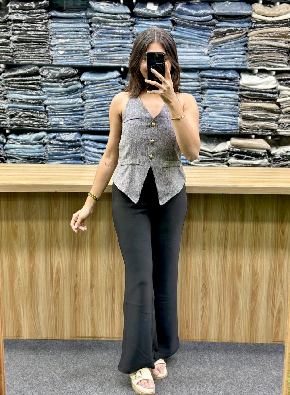 TOP :- The top is a sleeveless, V-neck waistcoat in a textured, possibly tweed or herringbone, fabric It is a slim-fit or tailored style.
