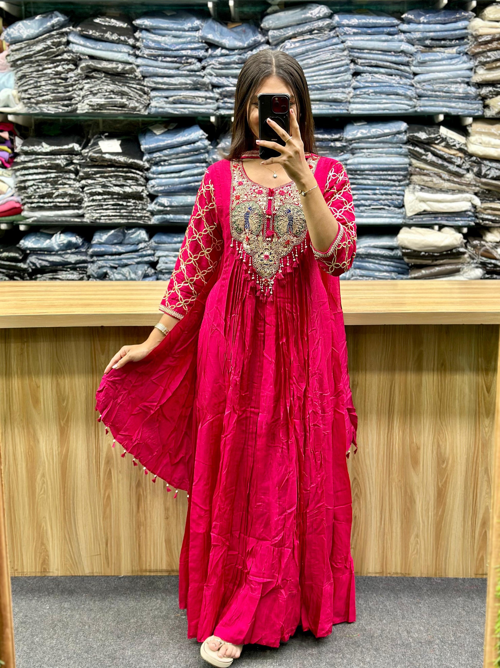 - Fabric: While the exact fabric isn't specified in the image, similar Anarkali gowns are often crafted from luxurious and flowy materials like faux georgette or modal silk, enhancing the drape and movement.
