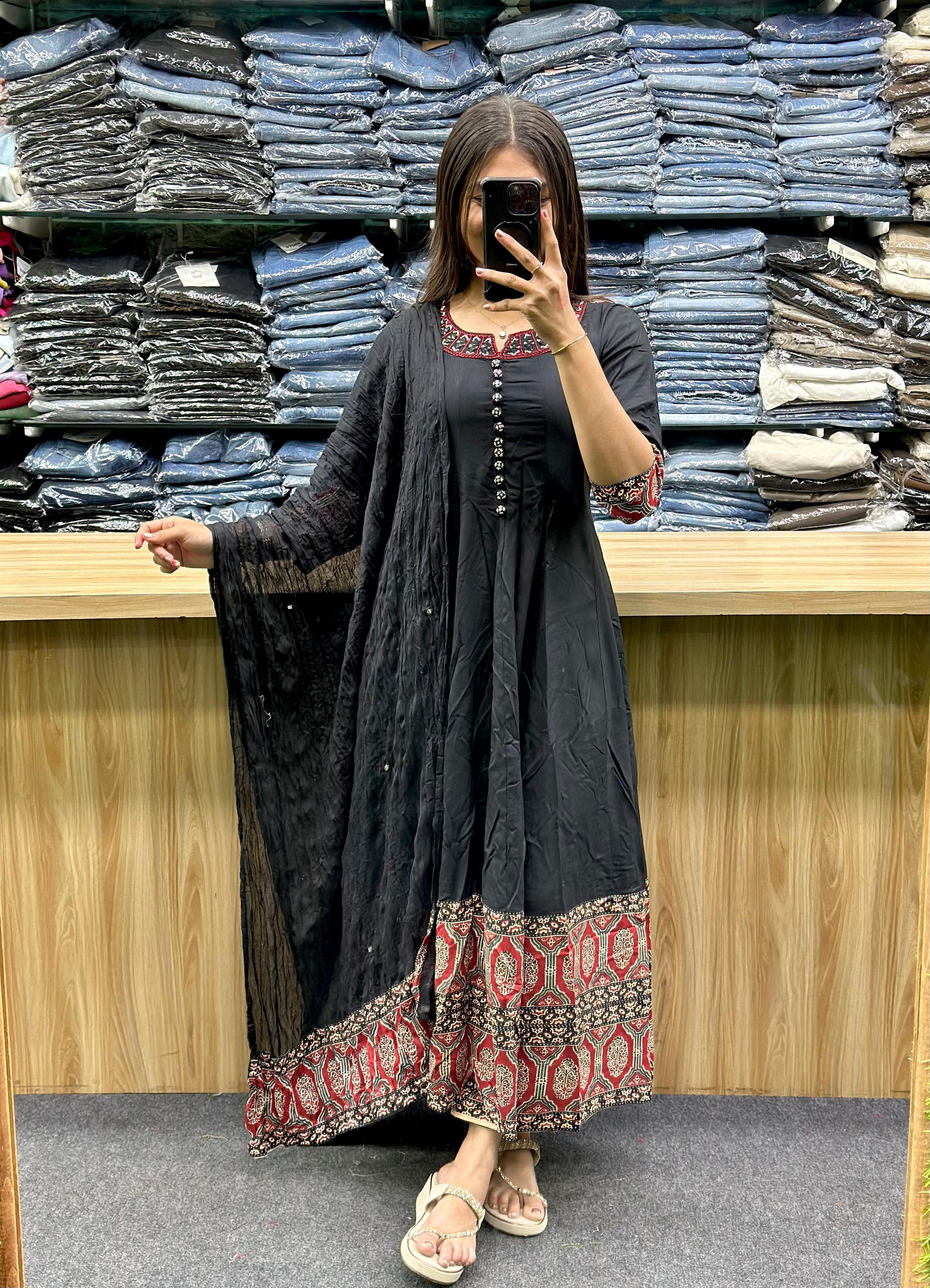 - Color and Fabric: The main body of the kurti is in a classic black color, providing a sophisticated base. Reyon metrial febric.