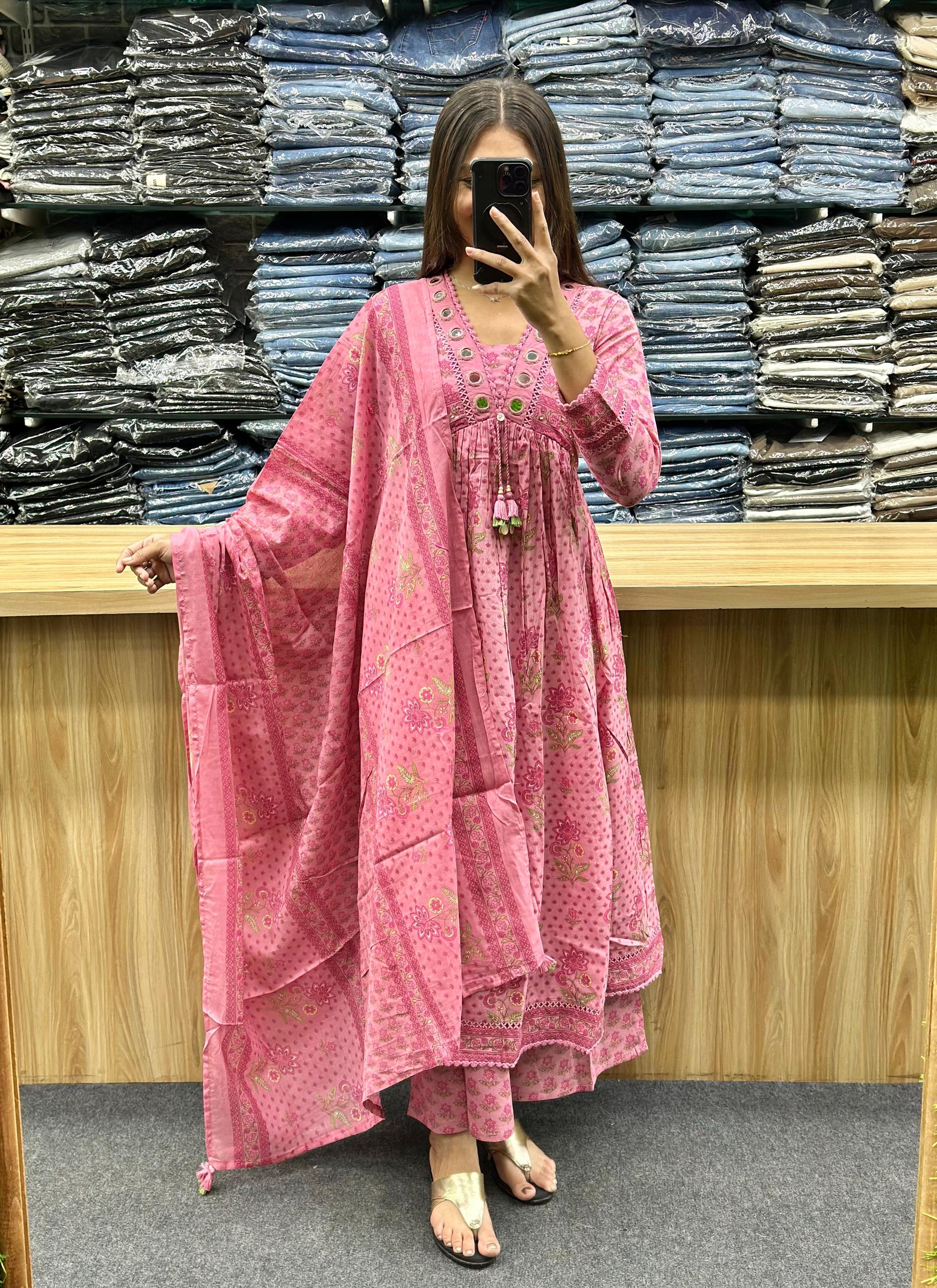 - Style: It's an ethnic wear ensemble, specifically an Anarkali-style kurta set, which features a flared, long kurta paired with comfortable pants and a coordinating dupatta.