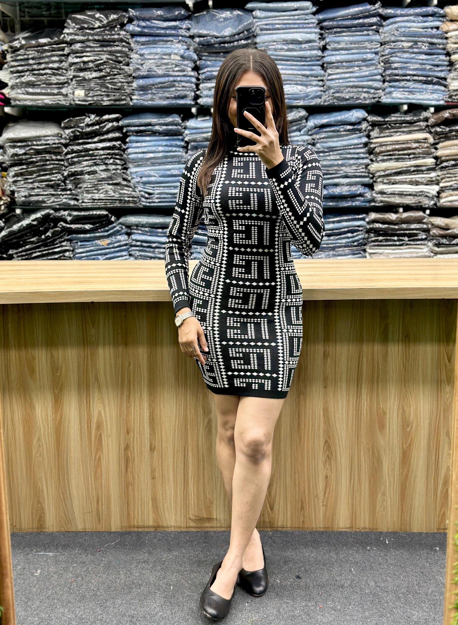 - Sleeves and Neckline: The dress features long sleeves and appears to have a high or crew neckline, giving it a sleek and sophisticated look.
