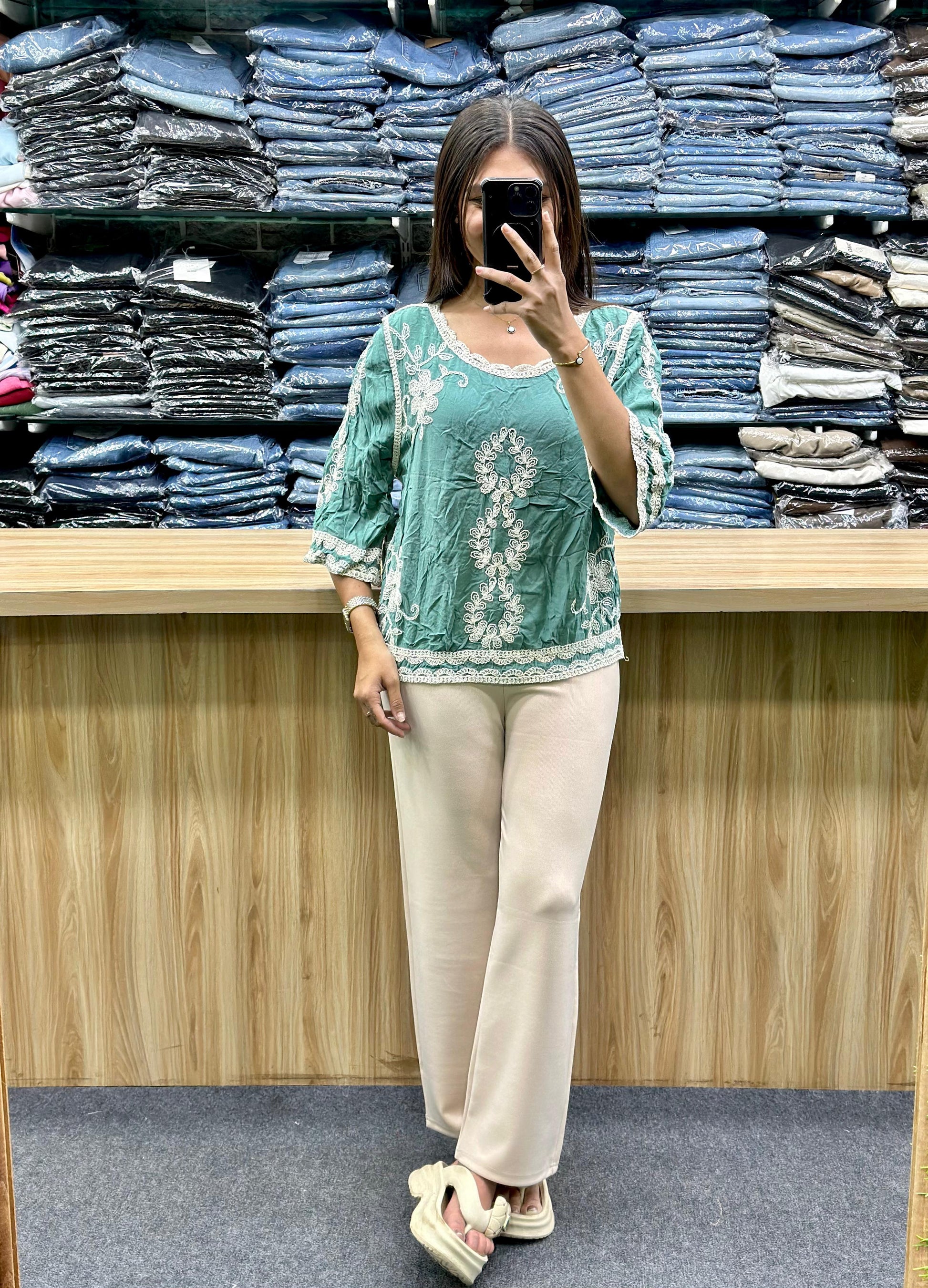 The top in the image is a top with white embroidery. It features a relaxed, flowy fit, typical of a peasant-style or bohemian top. The embroidery is intricate, likely Chikankari or a similar hand-embroidered style, and adorns the front, neckline, and sleeves of the blouse. It has three-quarter length sleeves and appears to be made from a lightweight, breathable fabric like cotton or rayon, suitable for casual wear.