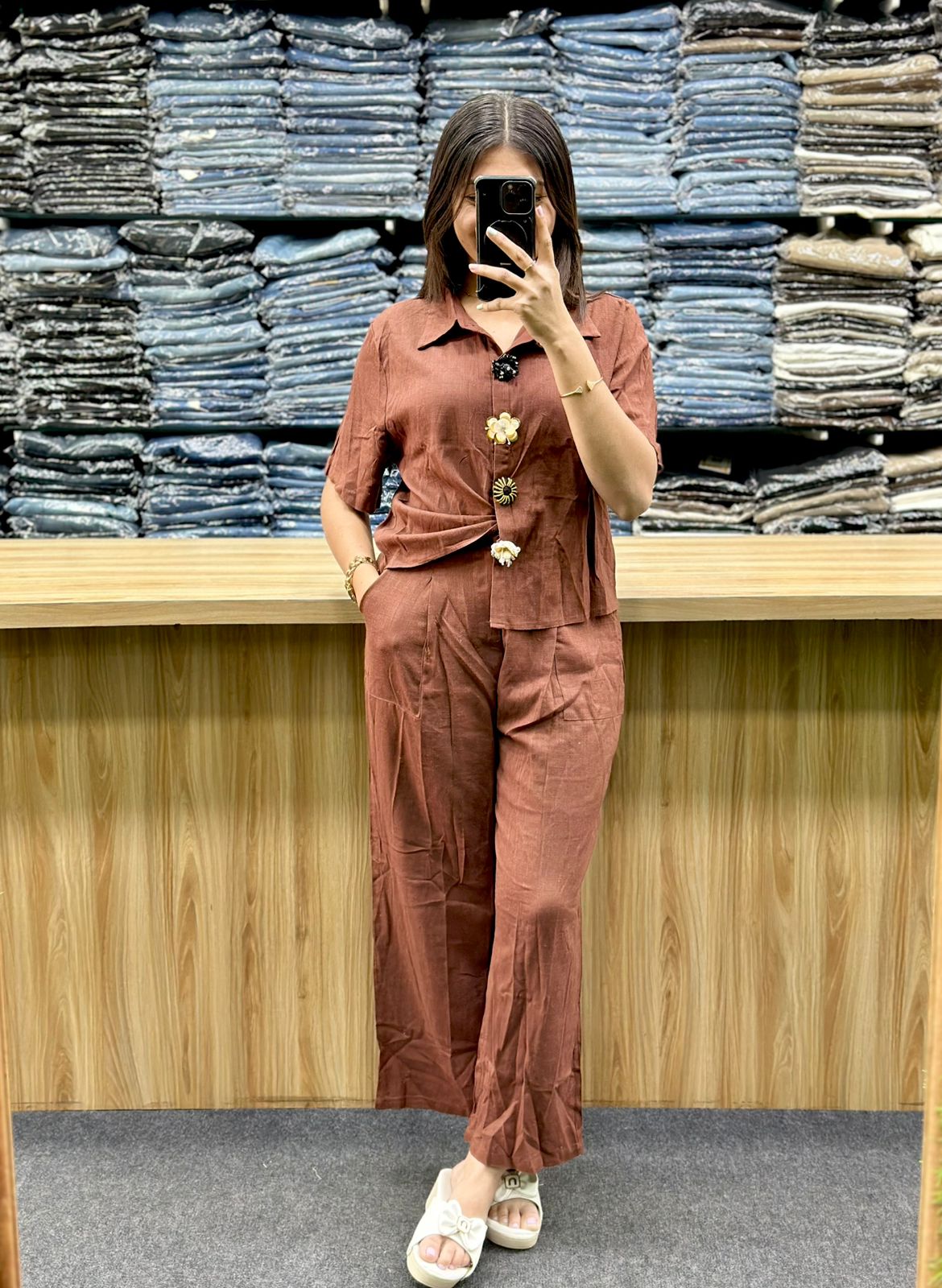 - Accessories: The person is wearing a gold-toned watch and bracelet on their left wrist, and white flat slip-on sandals