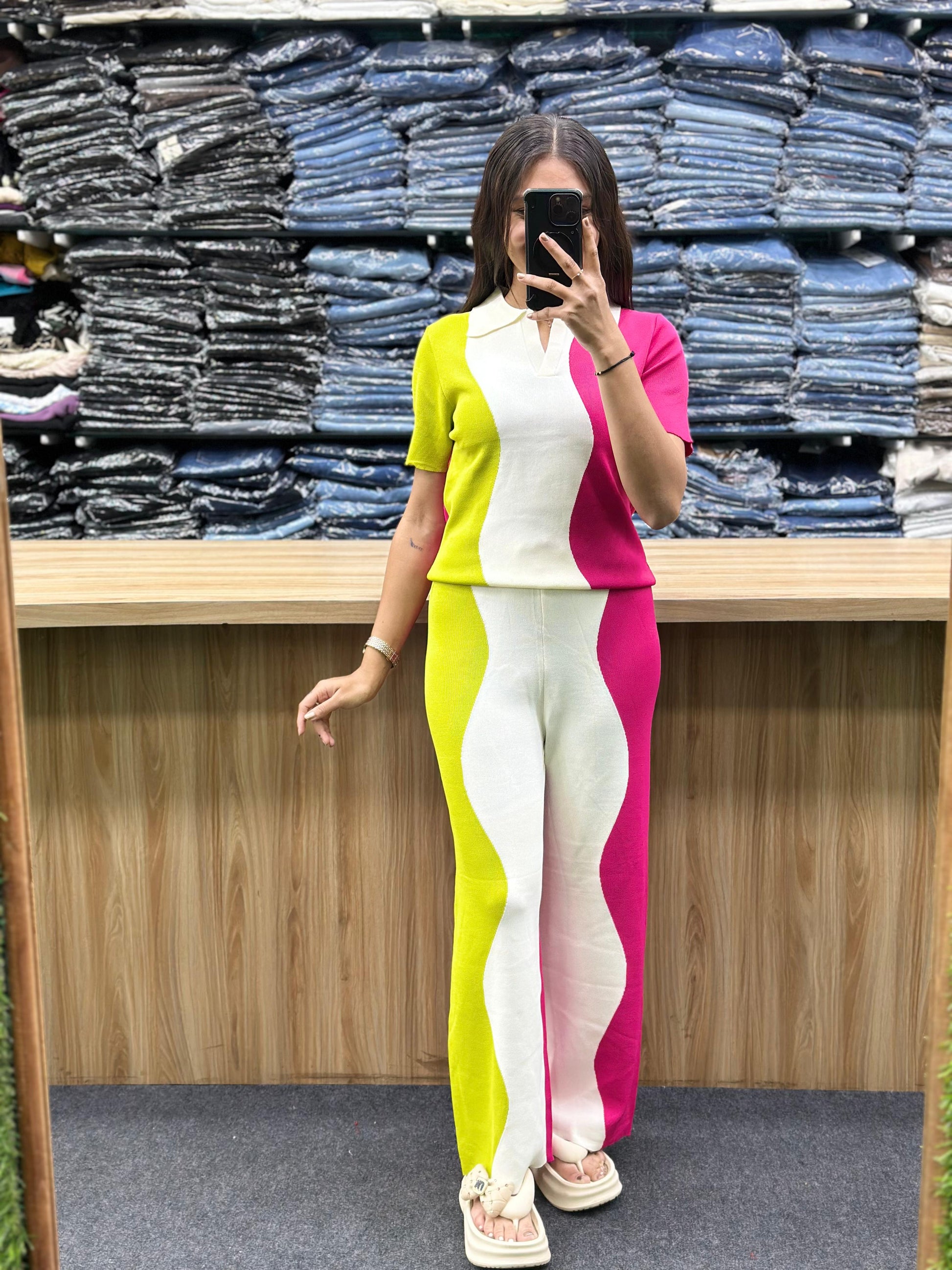 - Design: The set showcases a prominent color-block design with distinct sections of vibrant yellow, white, and hot pink on both the top and the pants, creating a striking visual appeal.