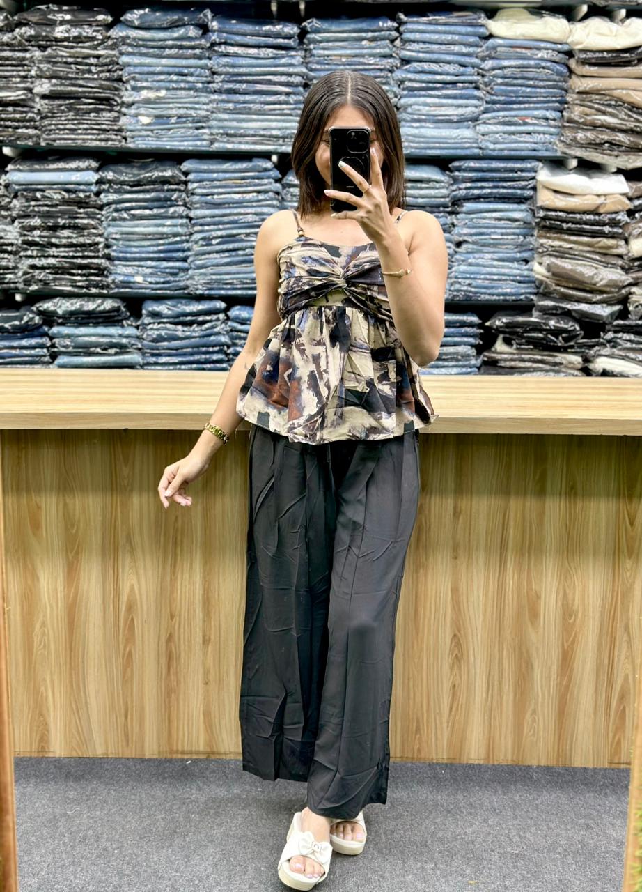 - Peplum Top: A sleeveless, abstract-printed peplum top in shades of beige, brown, and burnt orange. It features a gathered bust area and a flared hem.