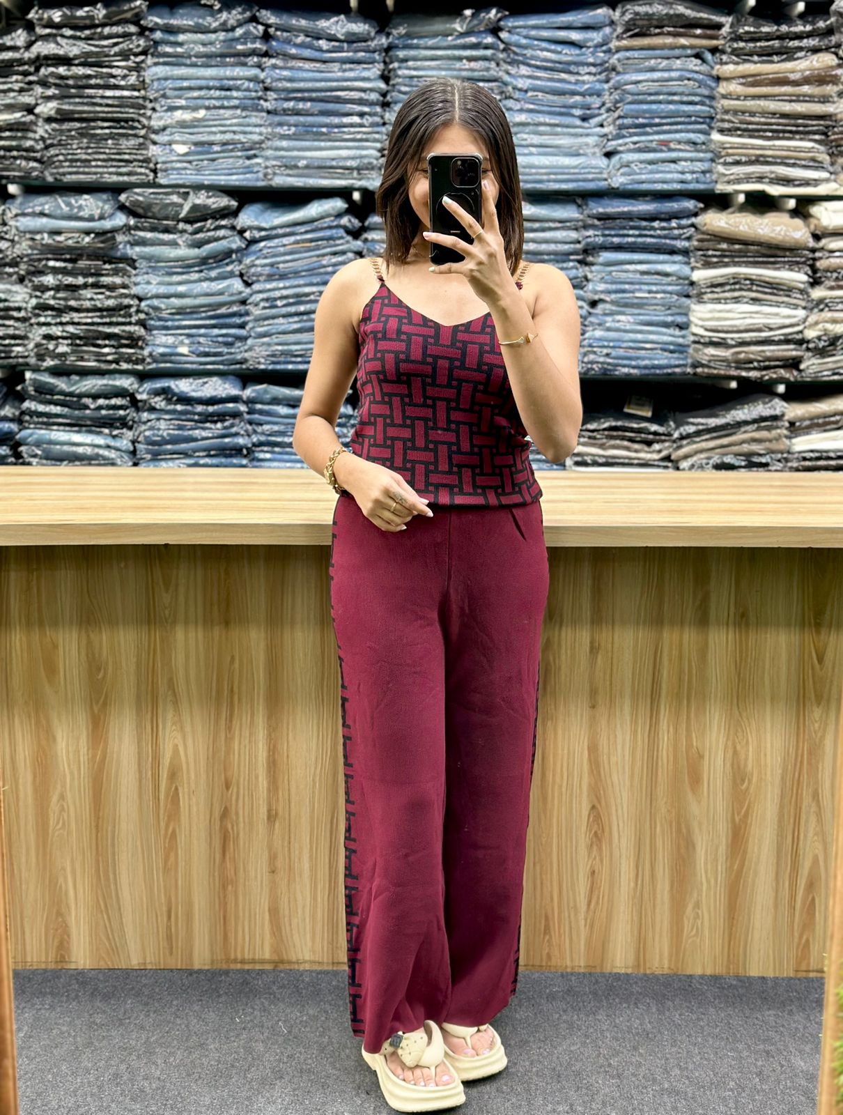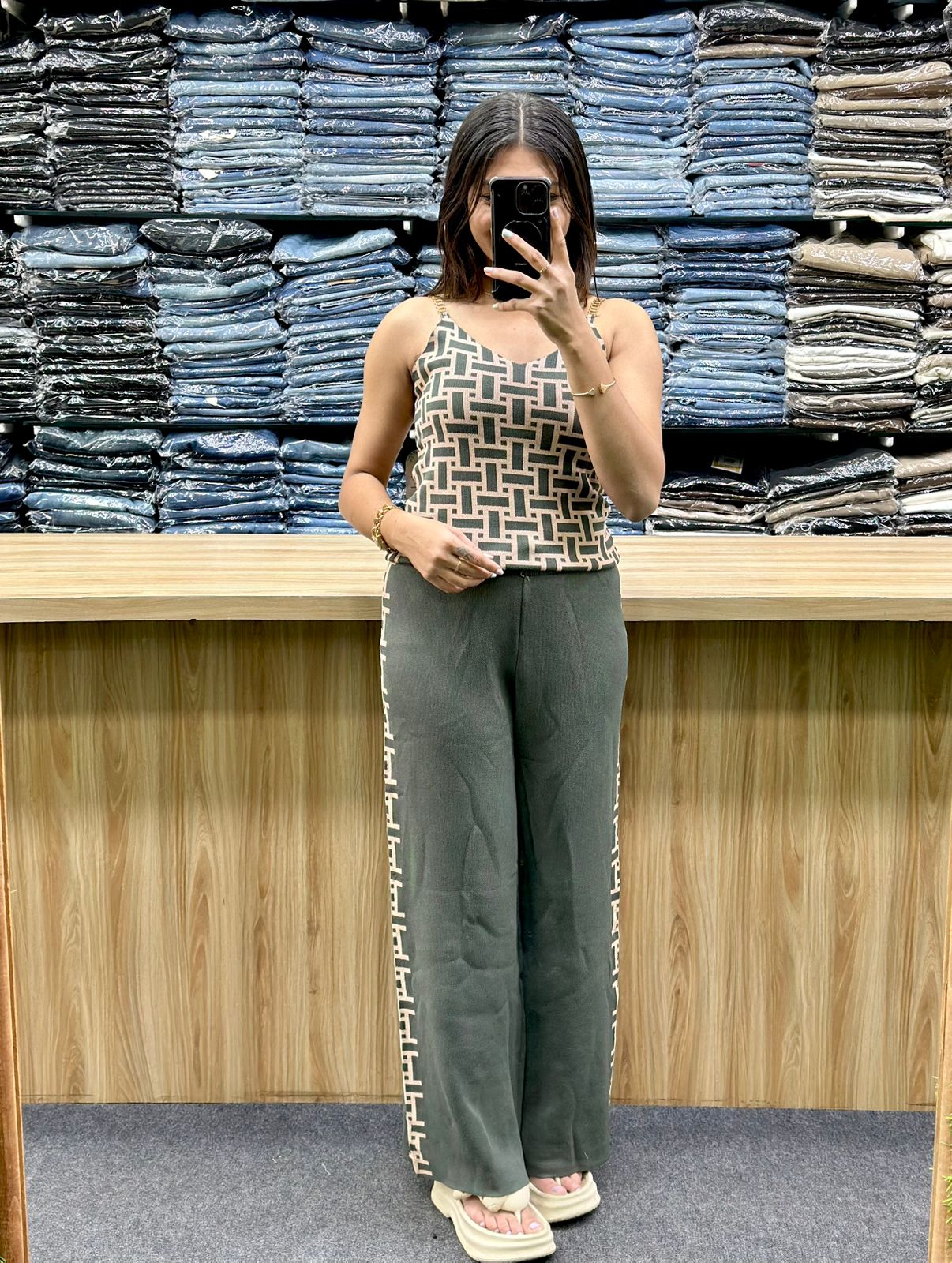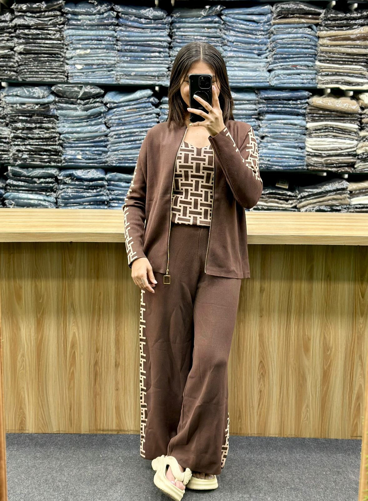 - Components: It features a matching open-front, long-sleeved cardigan with detailing on the sleeves. The inner top is sleeveless with a V-neck geometric pattern. The coordinating trousers are wide-legged with the same detailing running down the sides of the legs.
