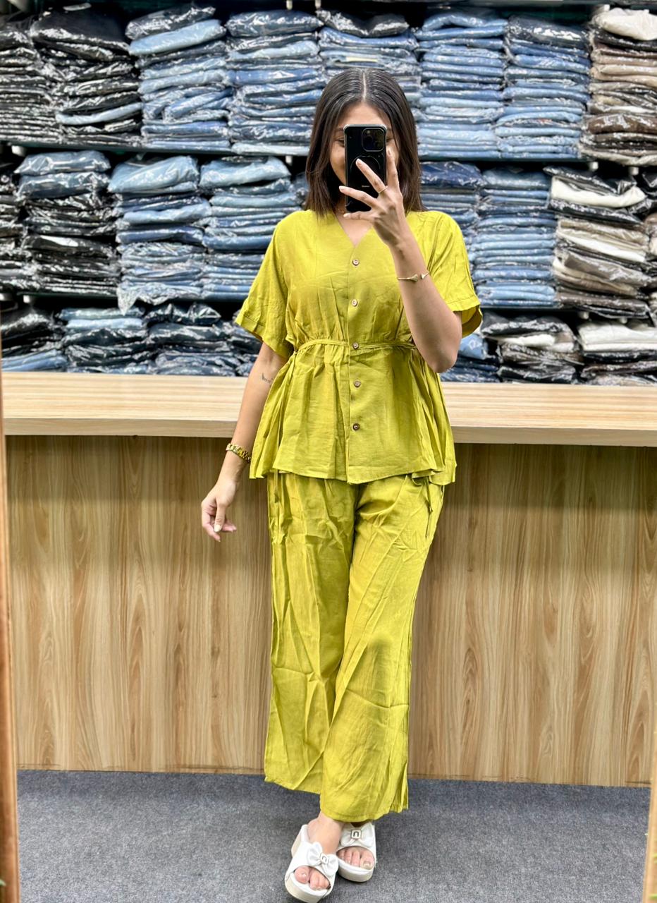 - Bottoms: Matching mid-rise, wide-leg or palazzo pants, which appear to have a relaxed fit and possibly an elasticated waistband for comfort.