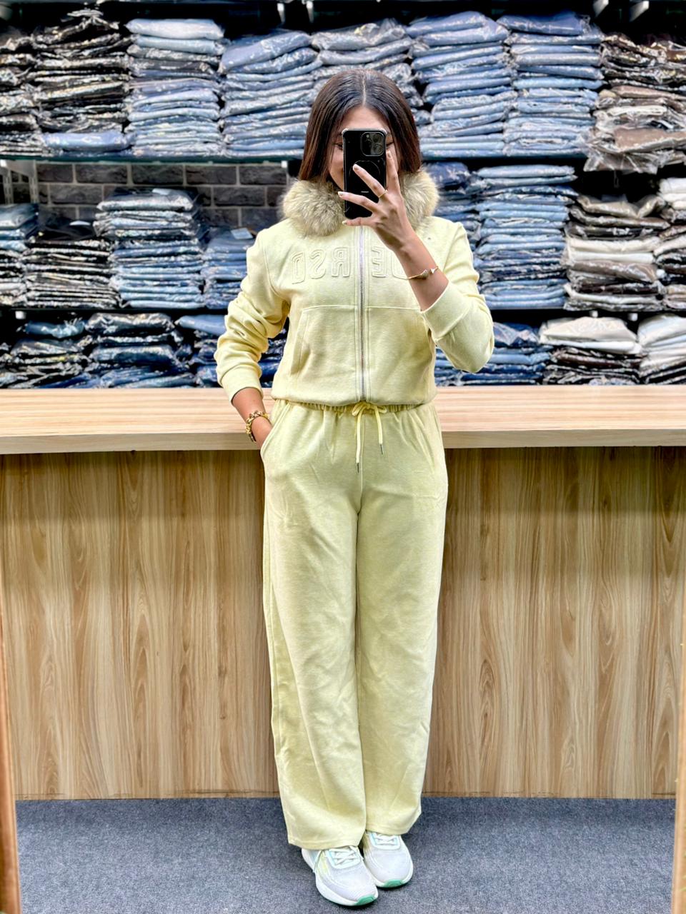 - Jacket: Full-sleeved, with a front zipper, pockets, and a contrasting light-colored (possibly beige or white) faux-fur collar. It has an embroidered logo or graphic on the left chest area.