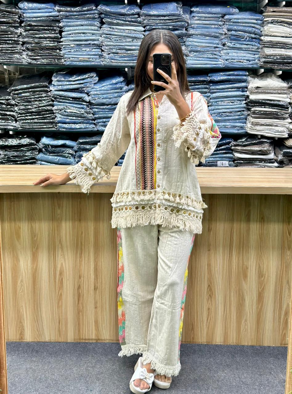 - The top has extensive multicoloured thread embroidery on the chest placket, neckline, and a horizontal band near the hem.