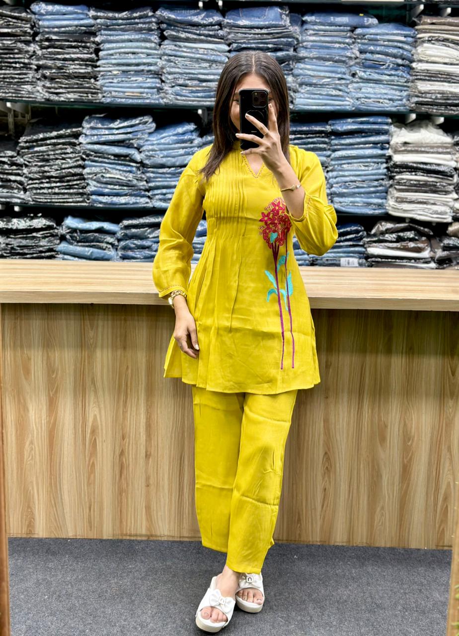 - Color: The ensemble is a vibrant mustard yellow hue and orange.