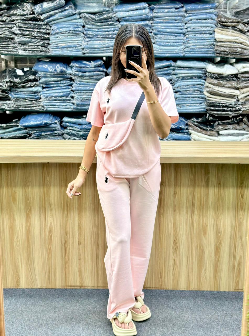 - Bottom: The top is paired with matching, wide-leg trousers or palazzo pants made from a soft material, cotton blend. These appear to have a comfortable, relaxed fit, suitable for casual or loungewear.