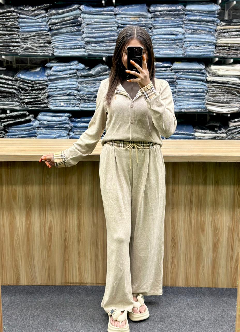 This is a beige knit two-piece outfit or co-ord set. The set consists of a long-sleeved collared top with a partial button placket and wide-leg trousers. The outfit features a checkered pattern as a trim on the collar, cuffs, and on the drawstring of the pants. The wide-leg trousers offer a comfortable, relaxed fit. The outfit is described as a lounge set or tracksuit.