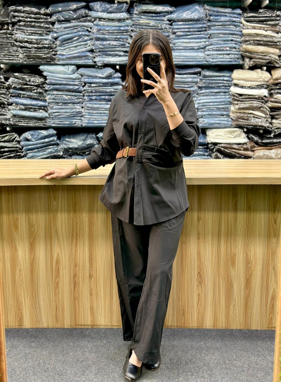 - Top: The top is a collared, button-down shirt with long sleeves that appear to be rolled up or fixed at the elbow. It has a slightly loose, tunic-like fit and some gathering at the waist.