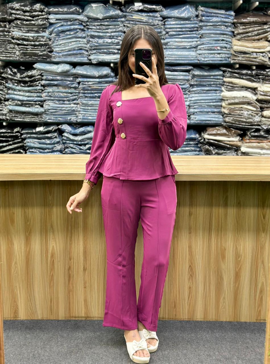 The outfit is a stylish two-piece co-ord set, which includes a peplum top and matching wide-leg trousers. This type of ensemble is often described as an elegant and versatile outfit for various occasions, from office wear to formal events.