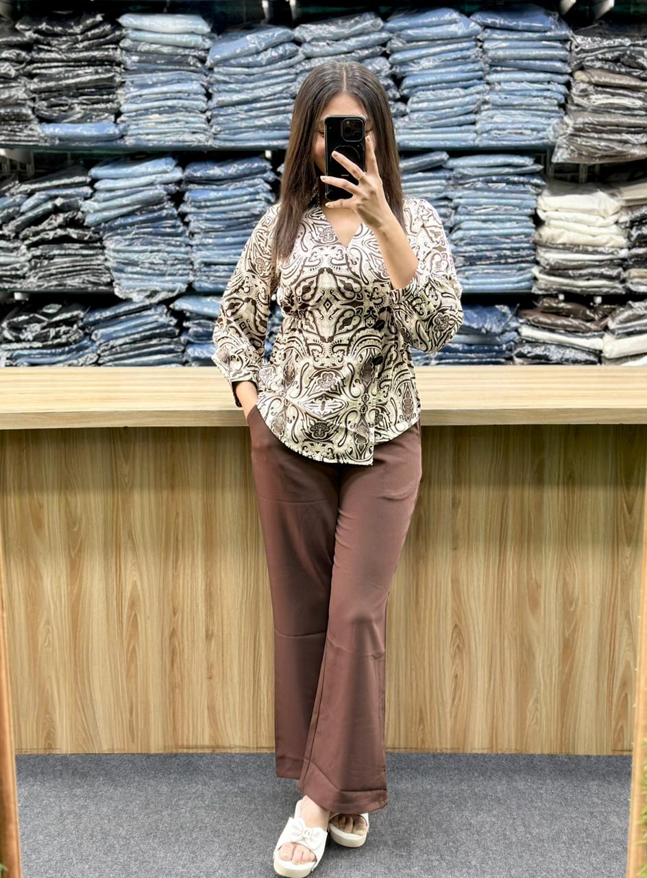 The outfit consists of a brown and off-white printed top paired with solid brown, wide-leg trousers. The top has a v-neckline, long sleeves, and features an intricate paisley and floral pattern.