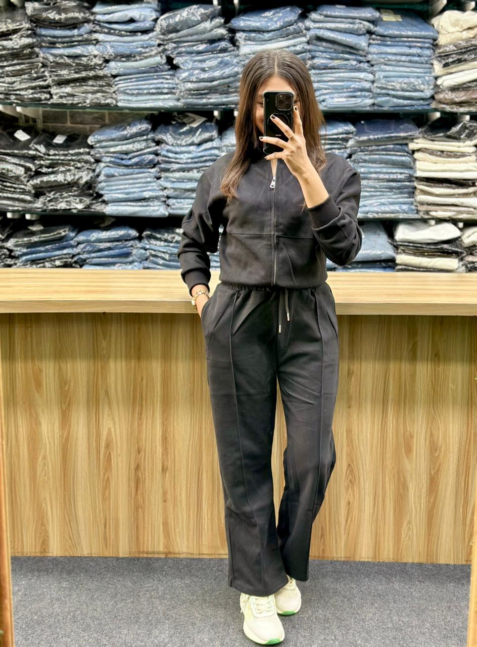- Bottoms: The matching trousers are wide-legged with a flared cut and also seem to have a small embroidered logo near the left hip.