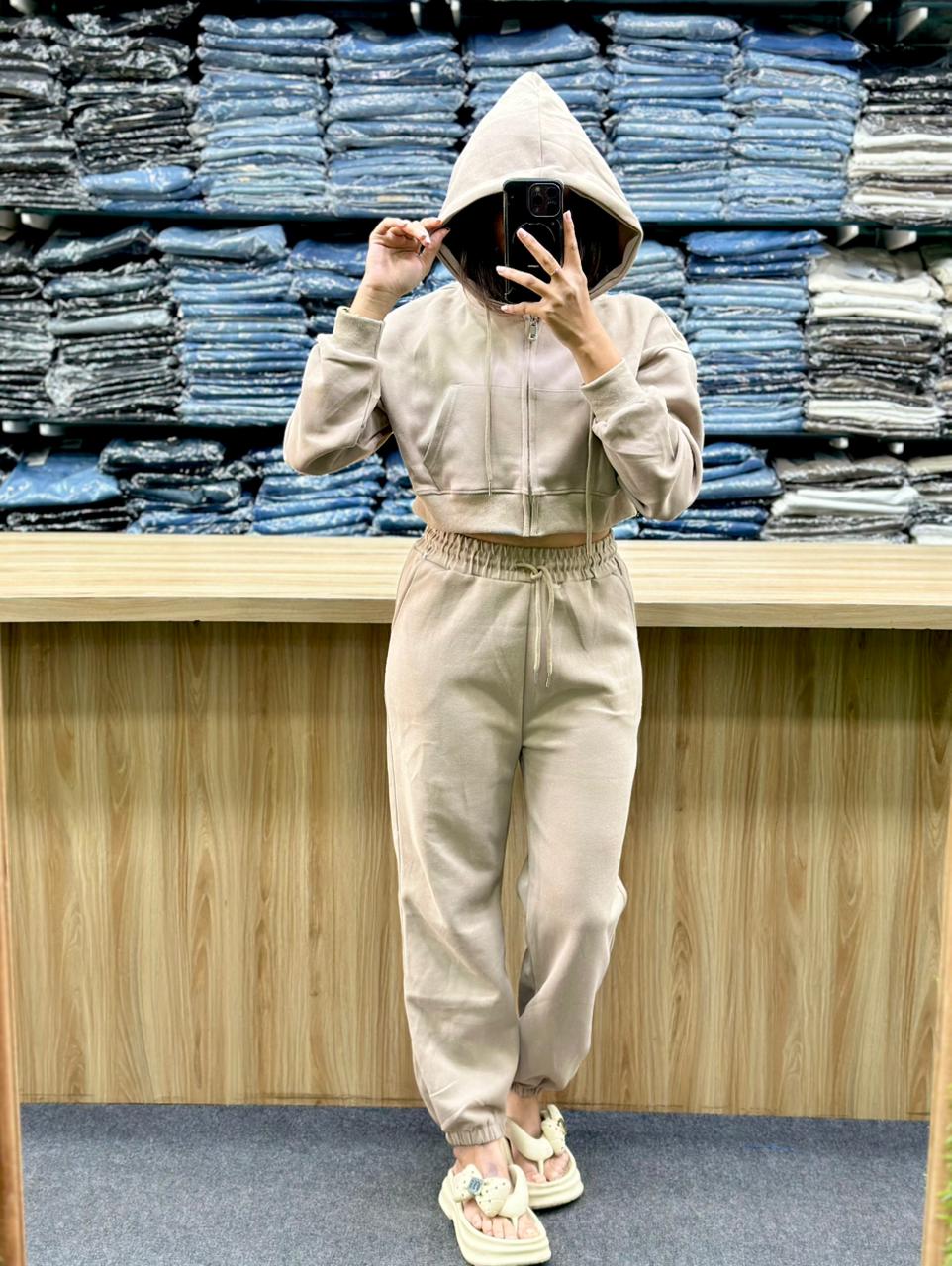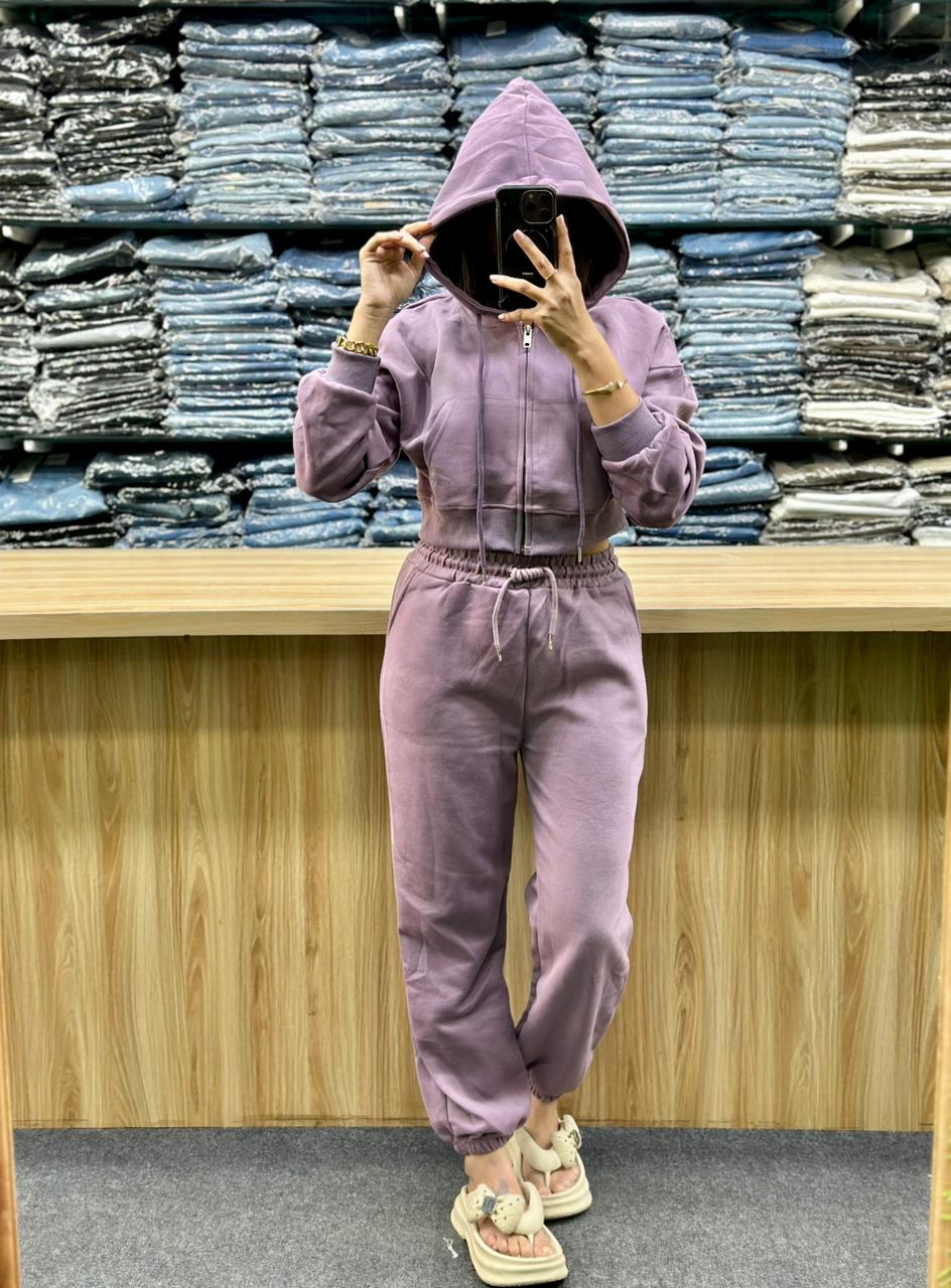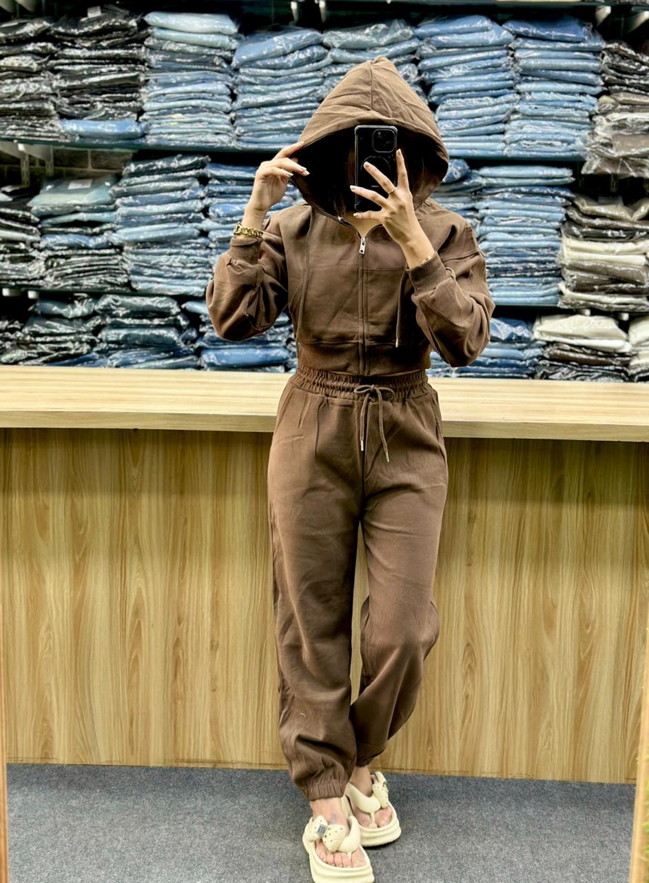 - Material and Style: The fabric appears to be a soft, possibly fleece or French terry material, ideal for comfort and warmth. It is a versatile look that can be worn for errands, light exercise, or simply lounging at home.