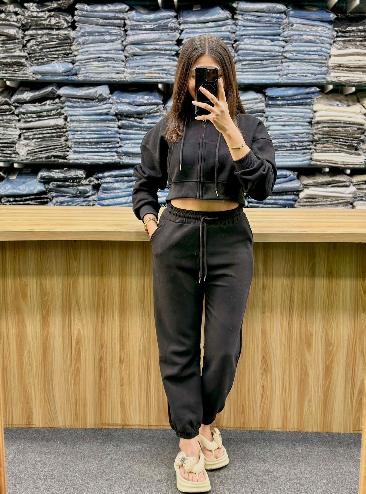 - Top: It features a cropped, zip-up hoodie with long sleeves and a fitted, elasticated waistband.