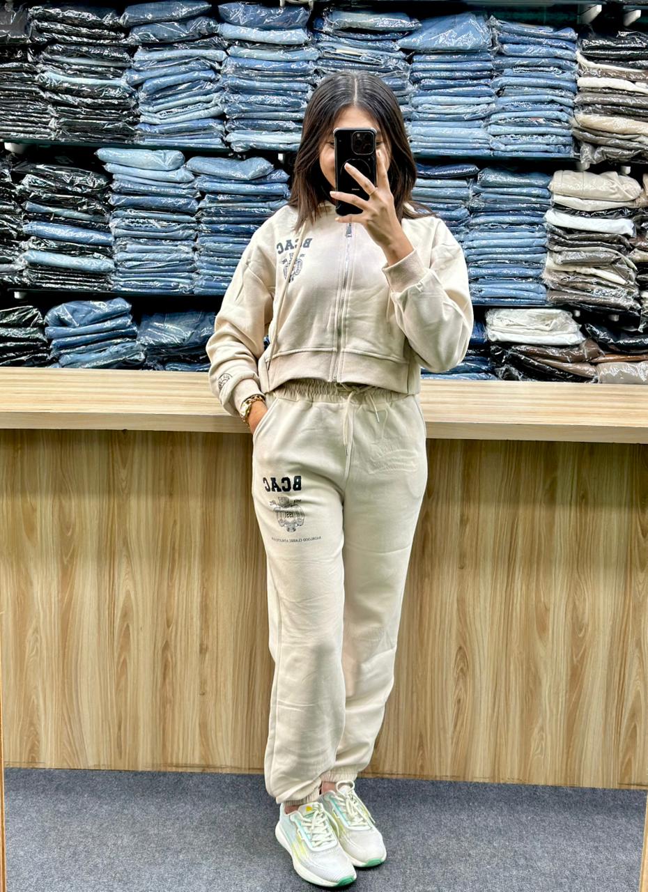 - Top: A light-colored (beige/oatmeal/cream) cropped hoodie with a full zip-front closure and long sleeves. It has a small logo, which appears to feature the letters "JA." on the upper left chest area.