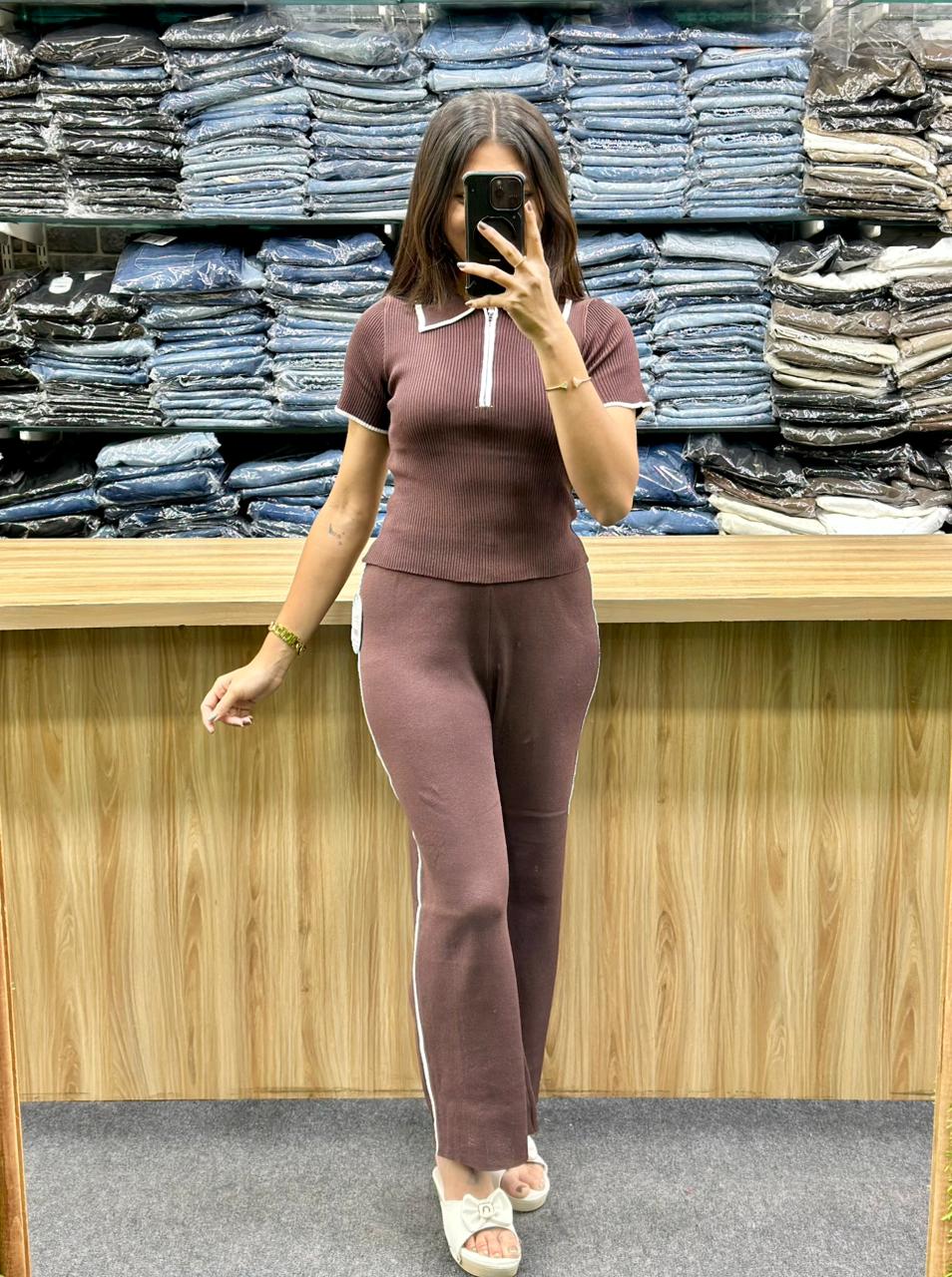 - Bottoms: The trousers are high-waisted with a flared or wide-leg cut. They have a white stripe running vertically down the outer seam of each leg.