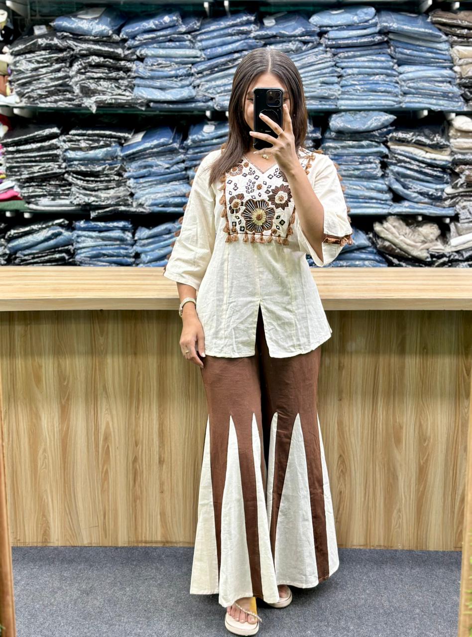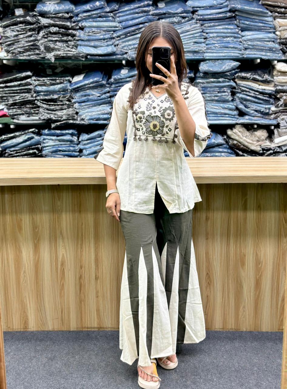 - Top: The top is a short, white or off-white tunic with three-quarter length sleeves. It features intricate black and white floral embroidery across the chest and shoulders. The tunic has a front slit and an A-line shape.