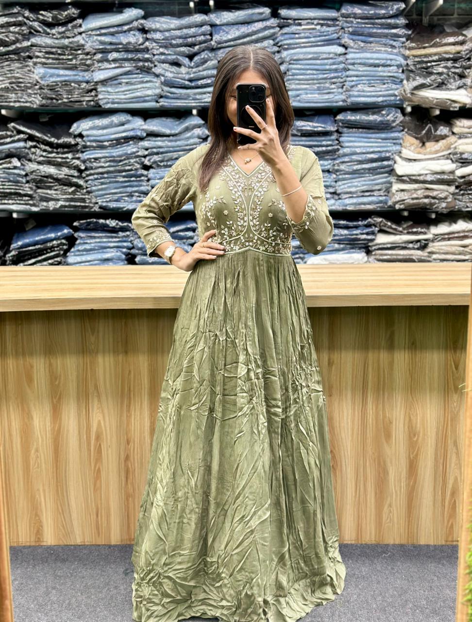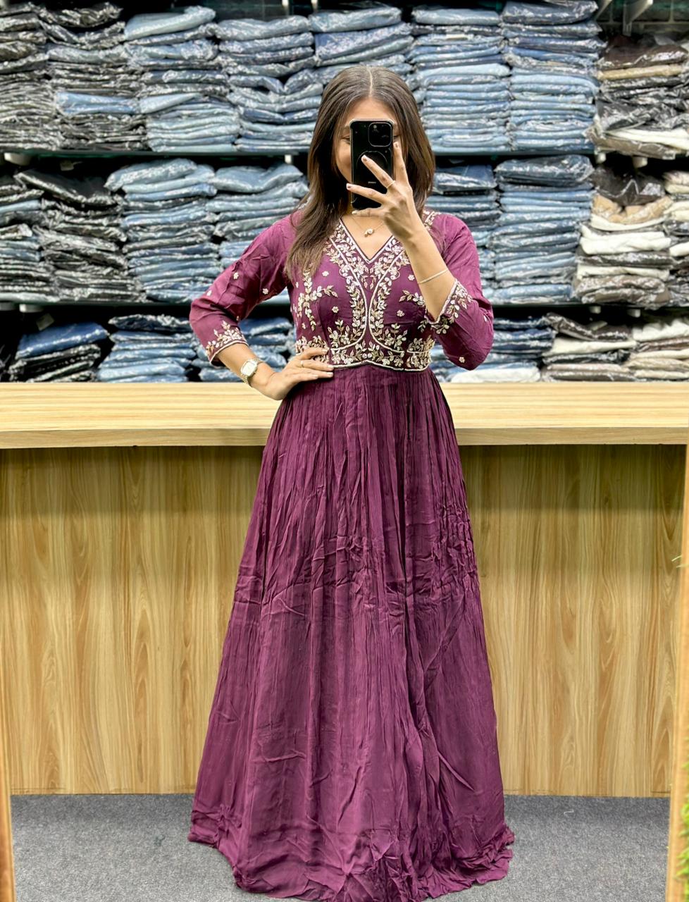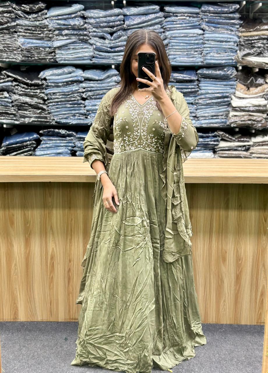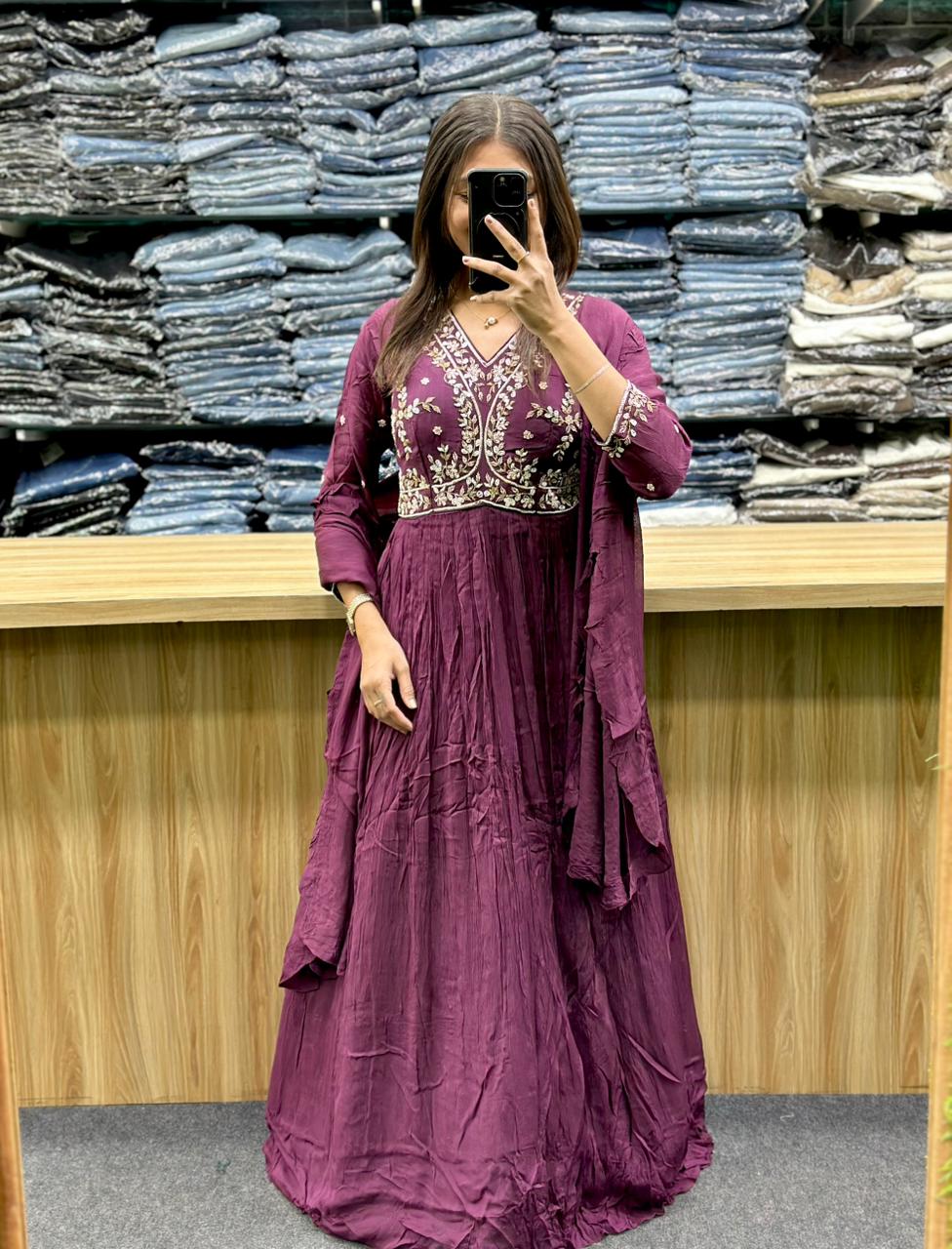 This is an Anarkali indowestern set with white embroidery. The dress features a crushed fabric texture on the flared anarkali craptop and is paired with a matching dupatta. The kurta has a fitted yoke and a flowy silhouette. Similar dresses are often made from fabrics like georgette or cotton and can be suitable for festive occasions, weddings, and parties.