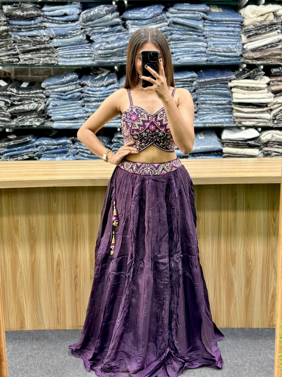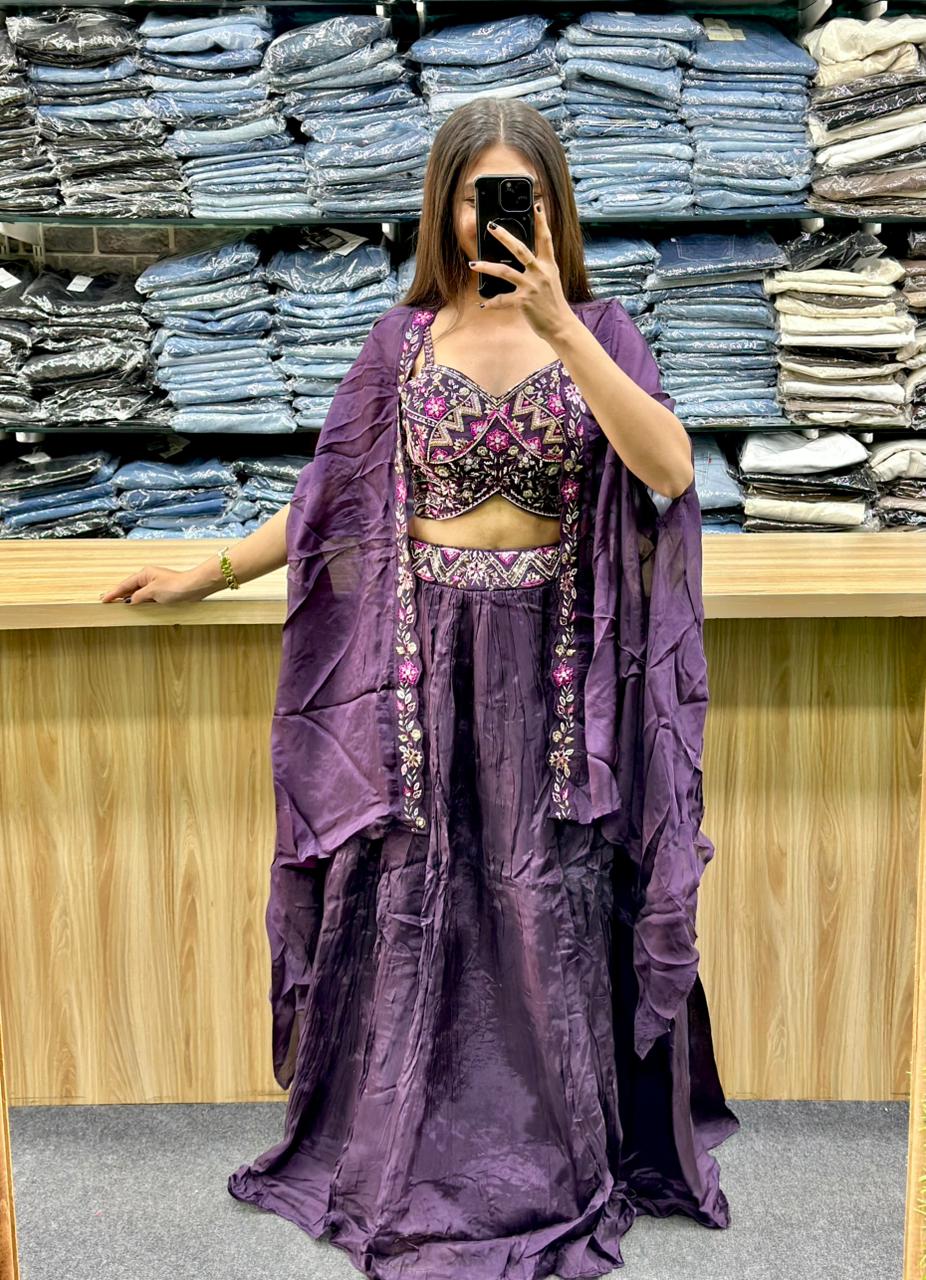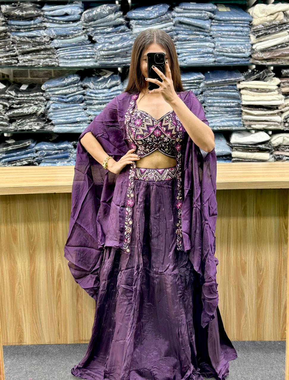 - Color and Fabric: The ensemble is a rich purple color. The skirt appears to have a slightly crushed or draped texture, possibly made of a soft material like organza or georgette.