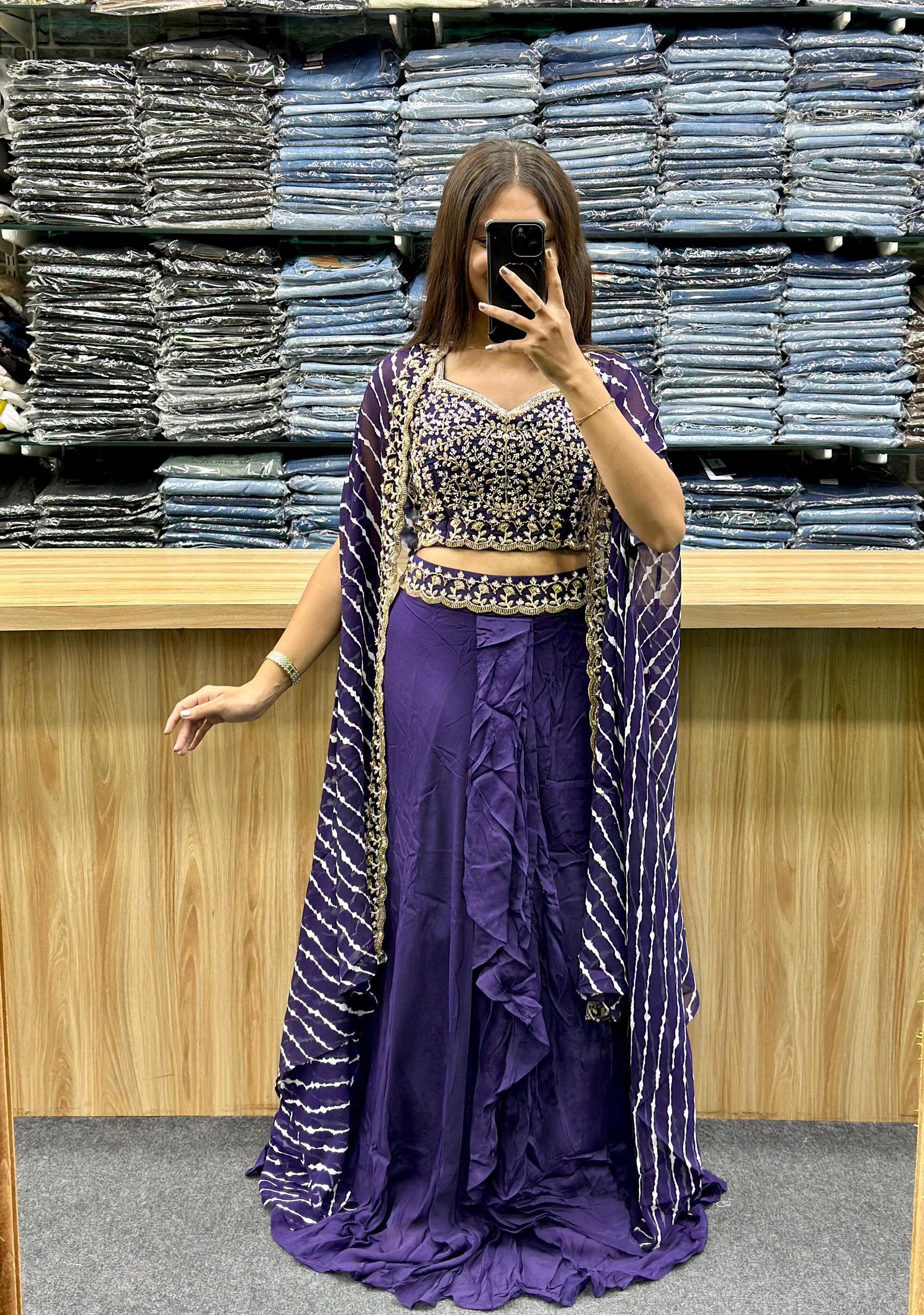 STYLE : CROP TOP / BLOUSE WITH HEAVY EMBROIDERY WORK WITH FLARED CRINKLED LEHENGA AND PRINTED SHRUG , INDO WESTERN LOOK
