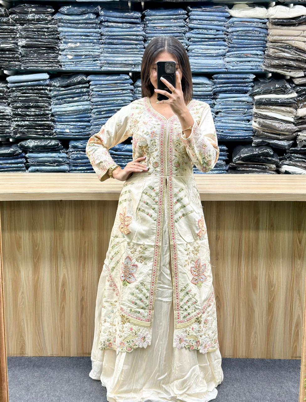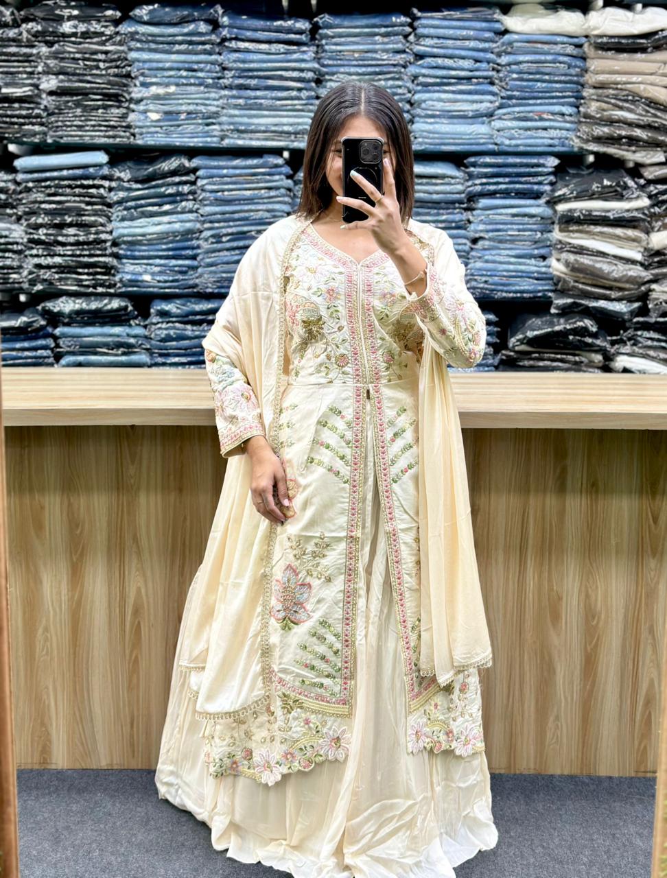 STYLE : LONG SHRUG WITH CENTER CUT, EMBROIDERY AND HAND WORK ON IT,PLAIN FLARED LEHENGA AND PLAIN DUPATTA