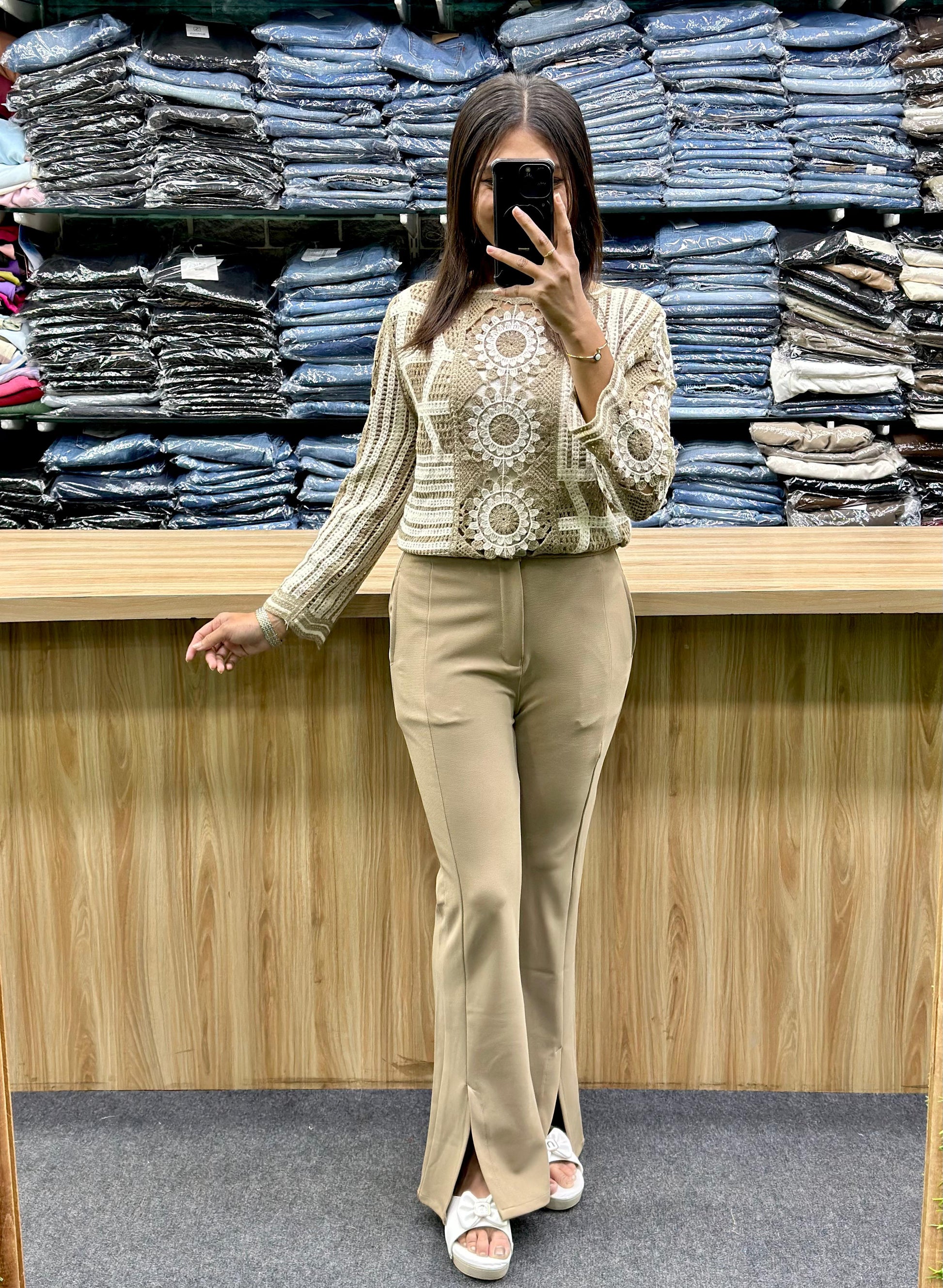 - Style: The top has a round neck and appears to be a front-open style, possibly designed to be worn as a top or even layered as a shrug over another garment.