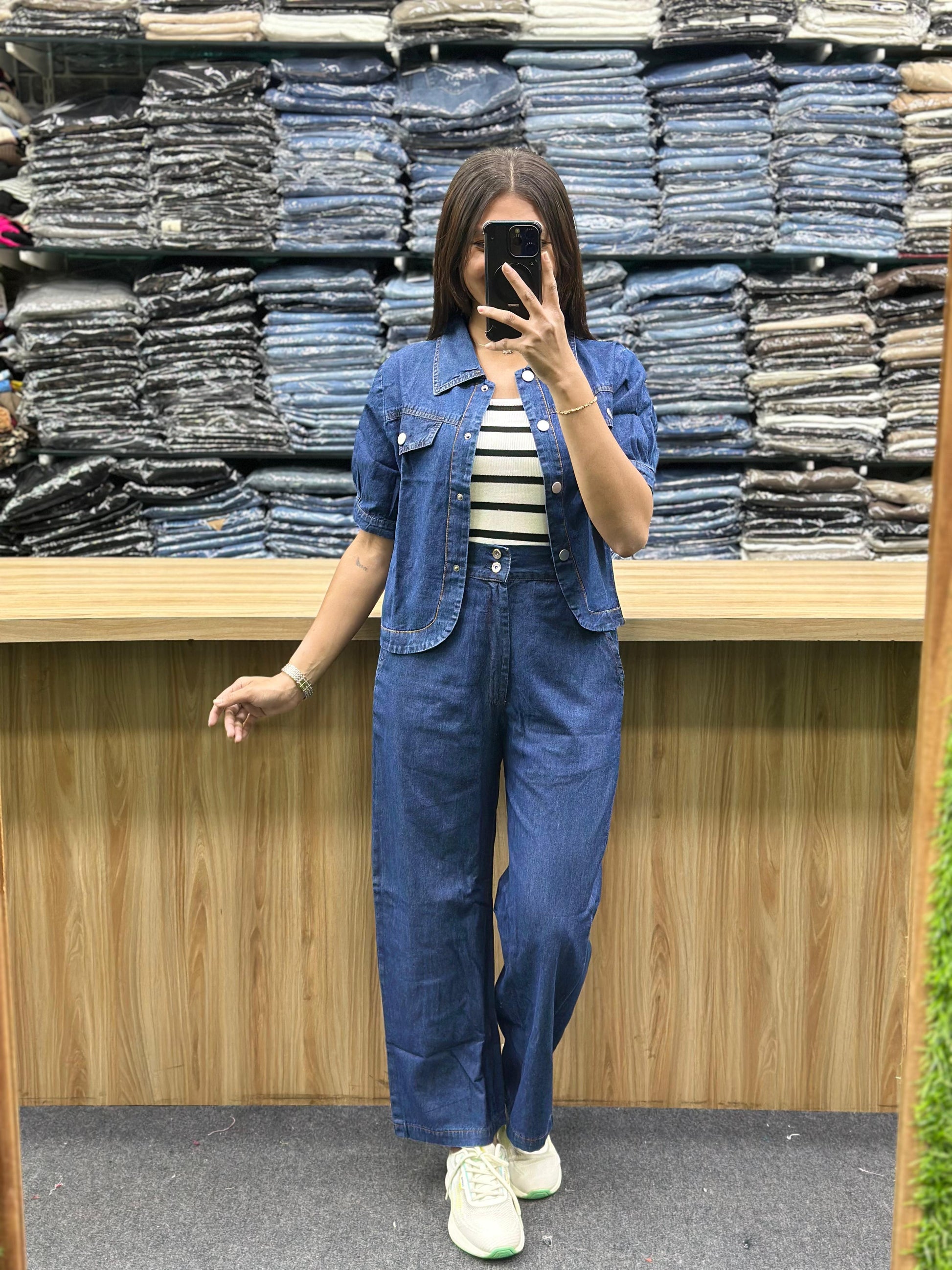 - Denim Pants: The bottom piece consists of matching wide-leg denim pants in the same medium blue wash as the jacket, offering a relaxed and comfortable fit.