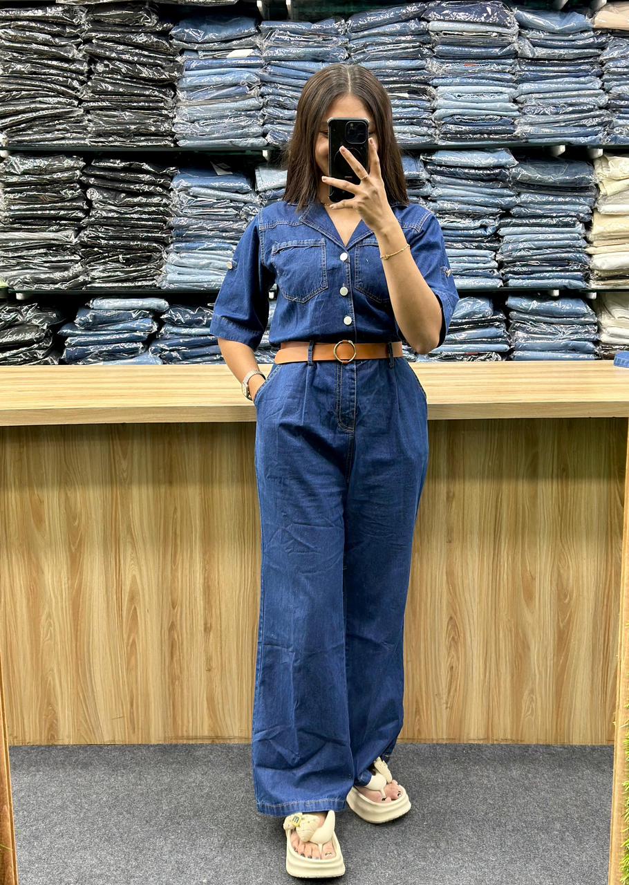 - Material and Color: The jumpsuit is made from a mid-tone blue denim fabric, giving it a classic and casual appeal.