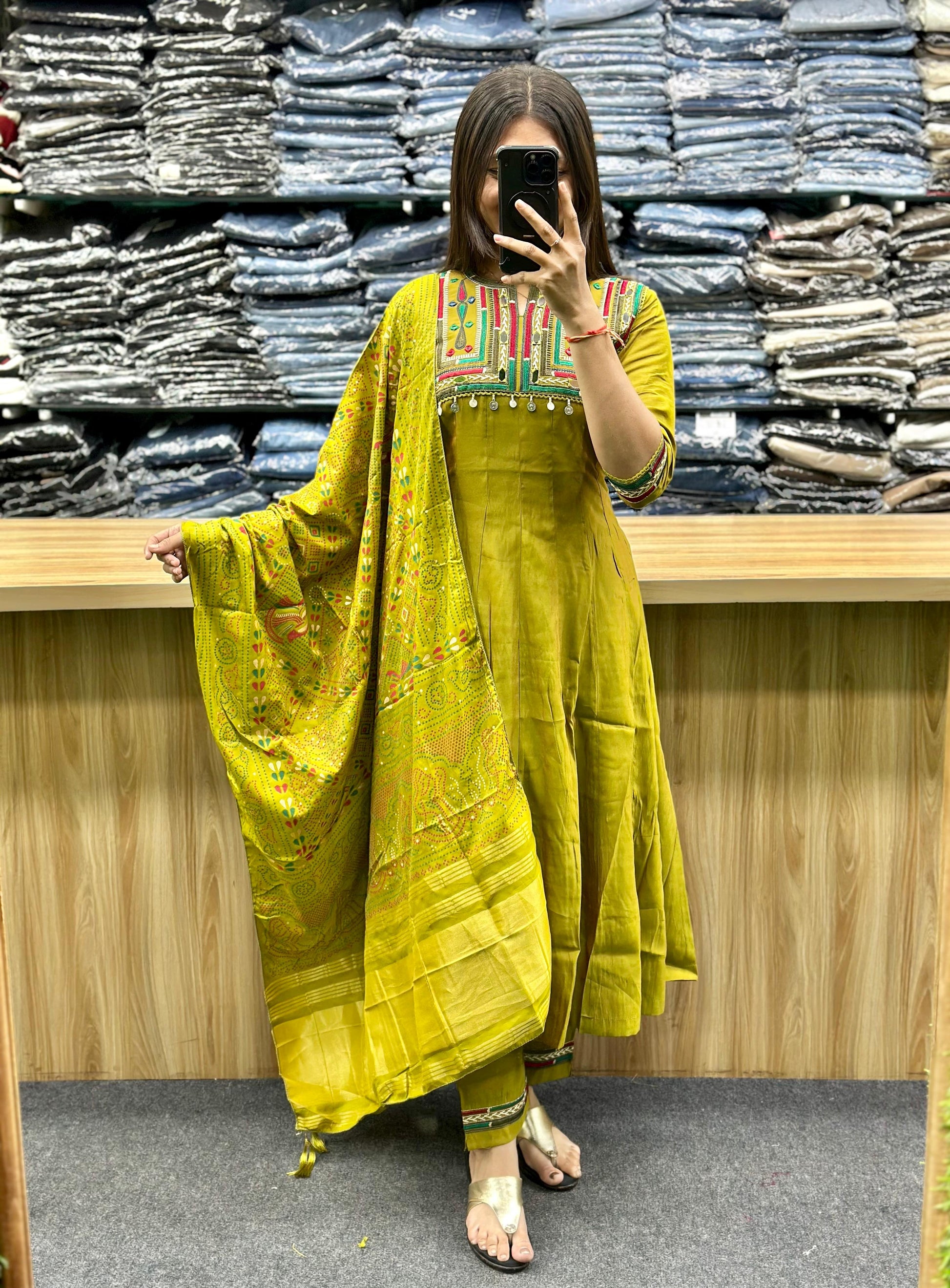 STYLE : ROUND KURTI WITH THREAD WORK ON CHEST AND NECK AREA ,MATCHING PENT AND PRINTED DUPATTA