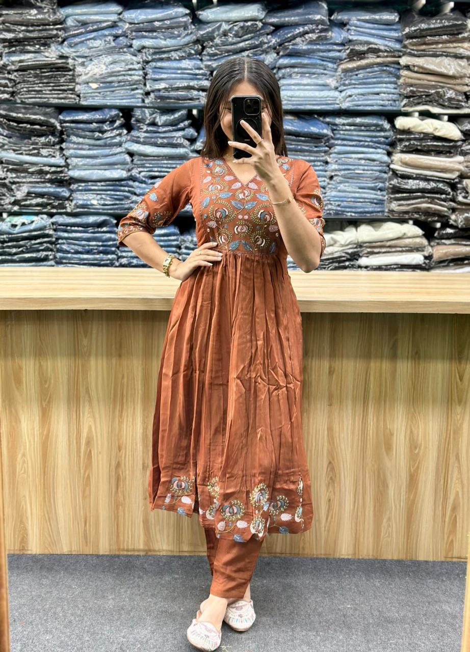 STYLE : ROUND KURTI WITH EMBROIDERY AND THREAD WORK AT CHEST AREA,SLEEVES BORDER,MATCHING PENT,BORDER WORKED DUPATTA