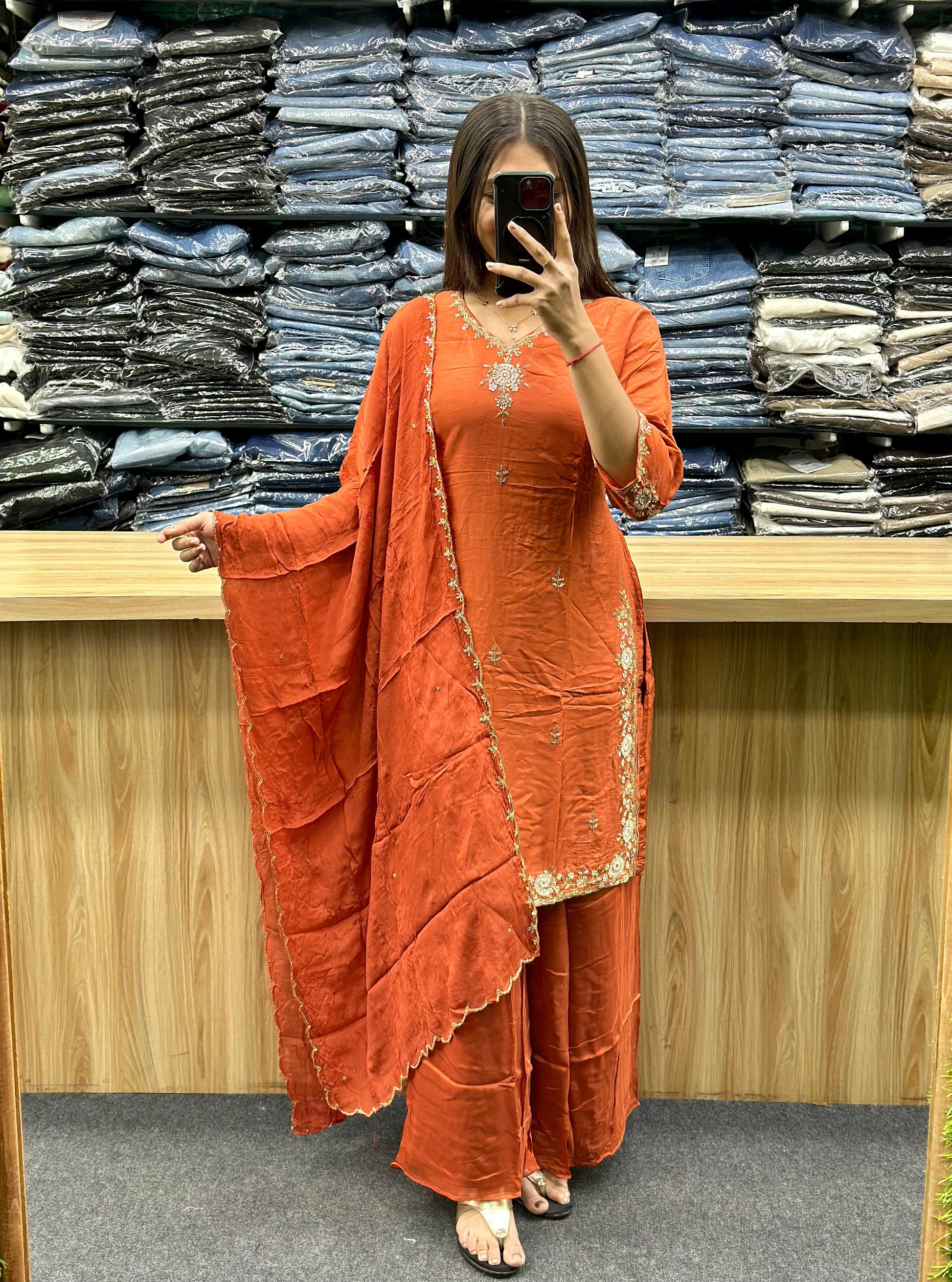STYLE : SHORT KURTI WITH EMBROIDERY WORK AT BOTH SIDE OF KURTI,NECK LINE AREA ,MATCHING FLARED PLAZA AND DUPATTA