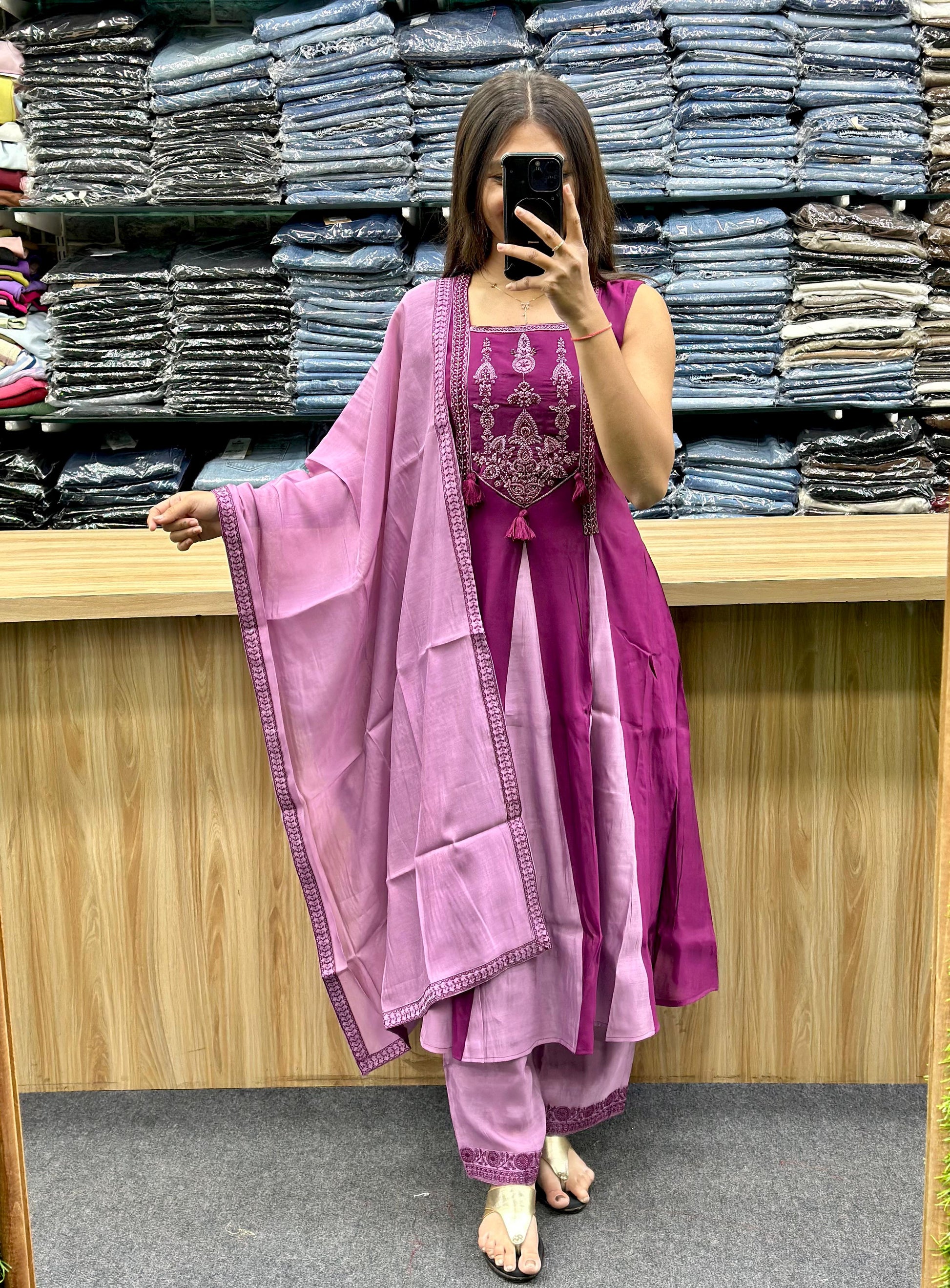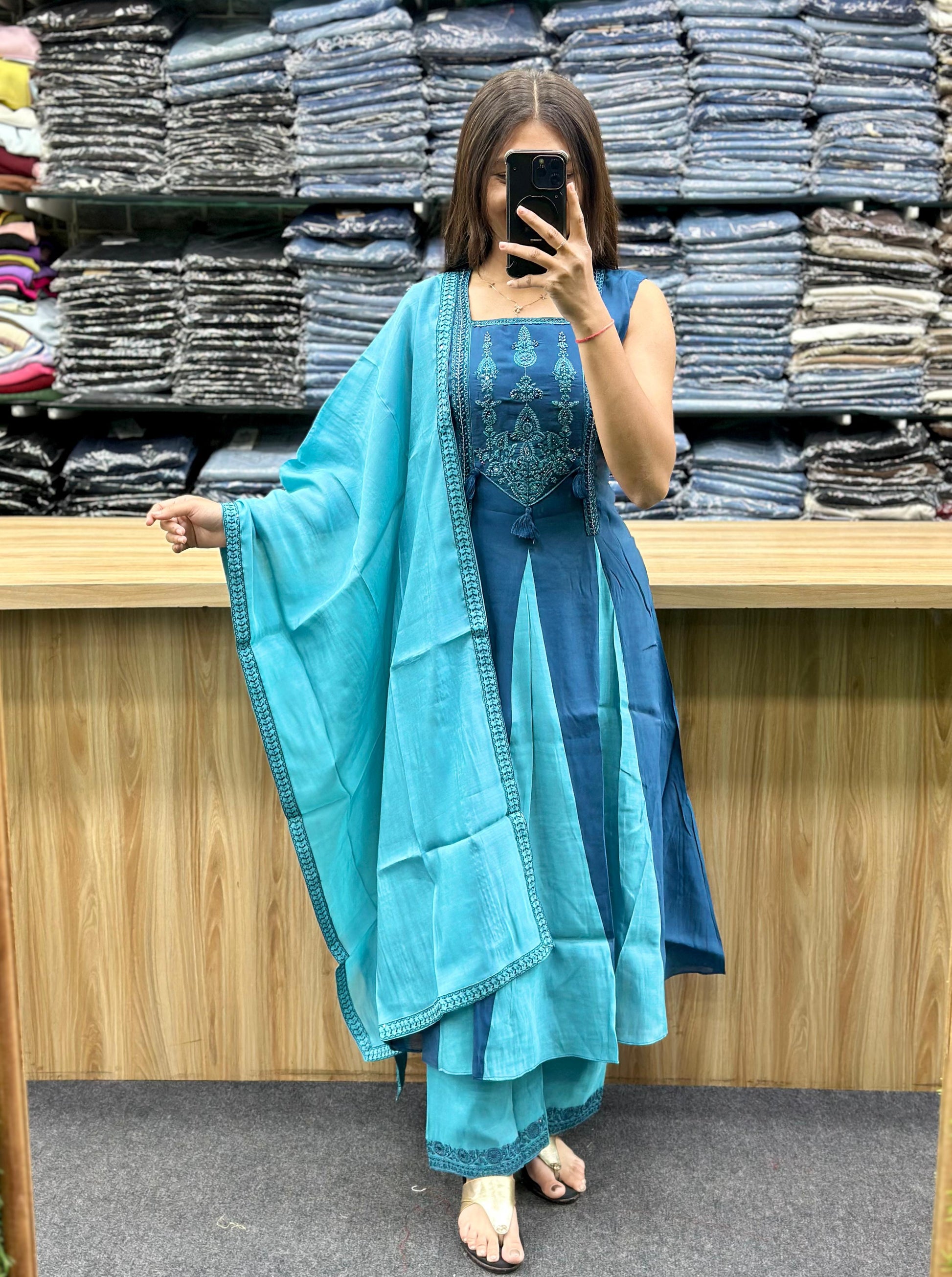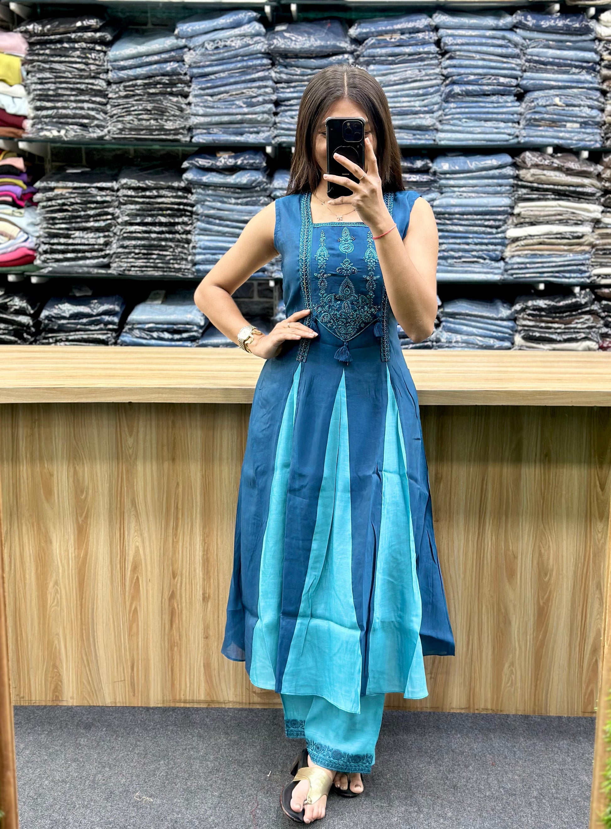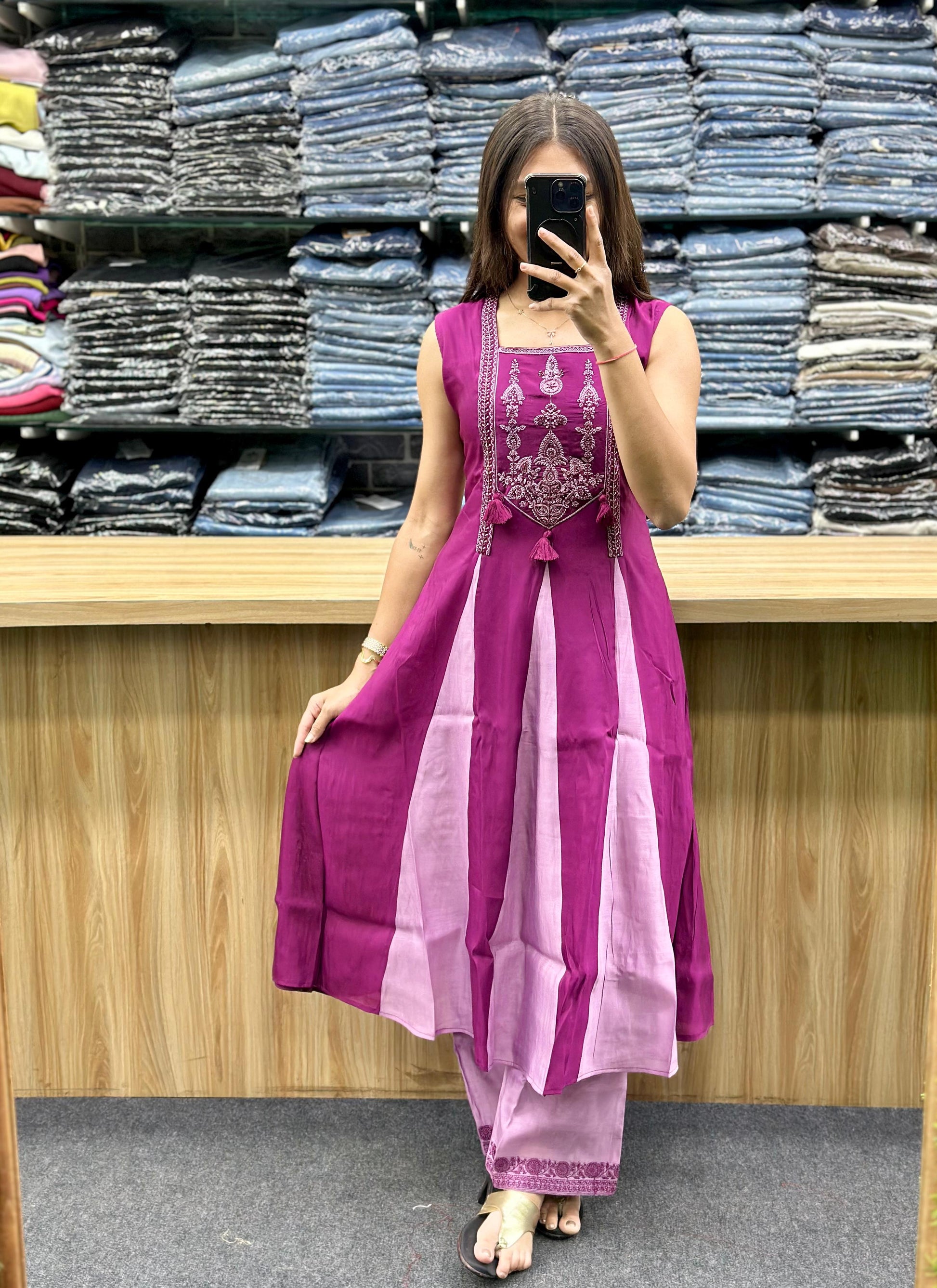 - Kurta: It's an Anarkali-style kurta in a darker , featuring a flared silhouette and intricate embroidery on the yoke/bodice area, possibly with a square neckline.