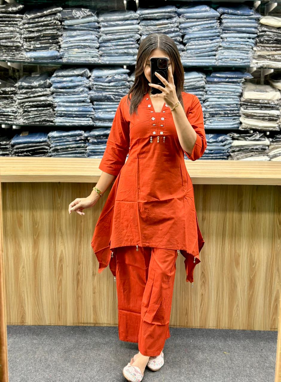 - Color & Fabric: The ensemble is a rich, burnt orange color and appears to be made from a lightweight, flowy fabric, possibly cotton or a cotton blend, that drapes comfortably.