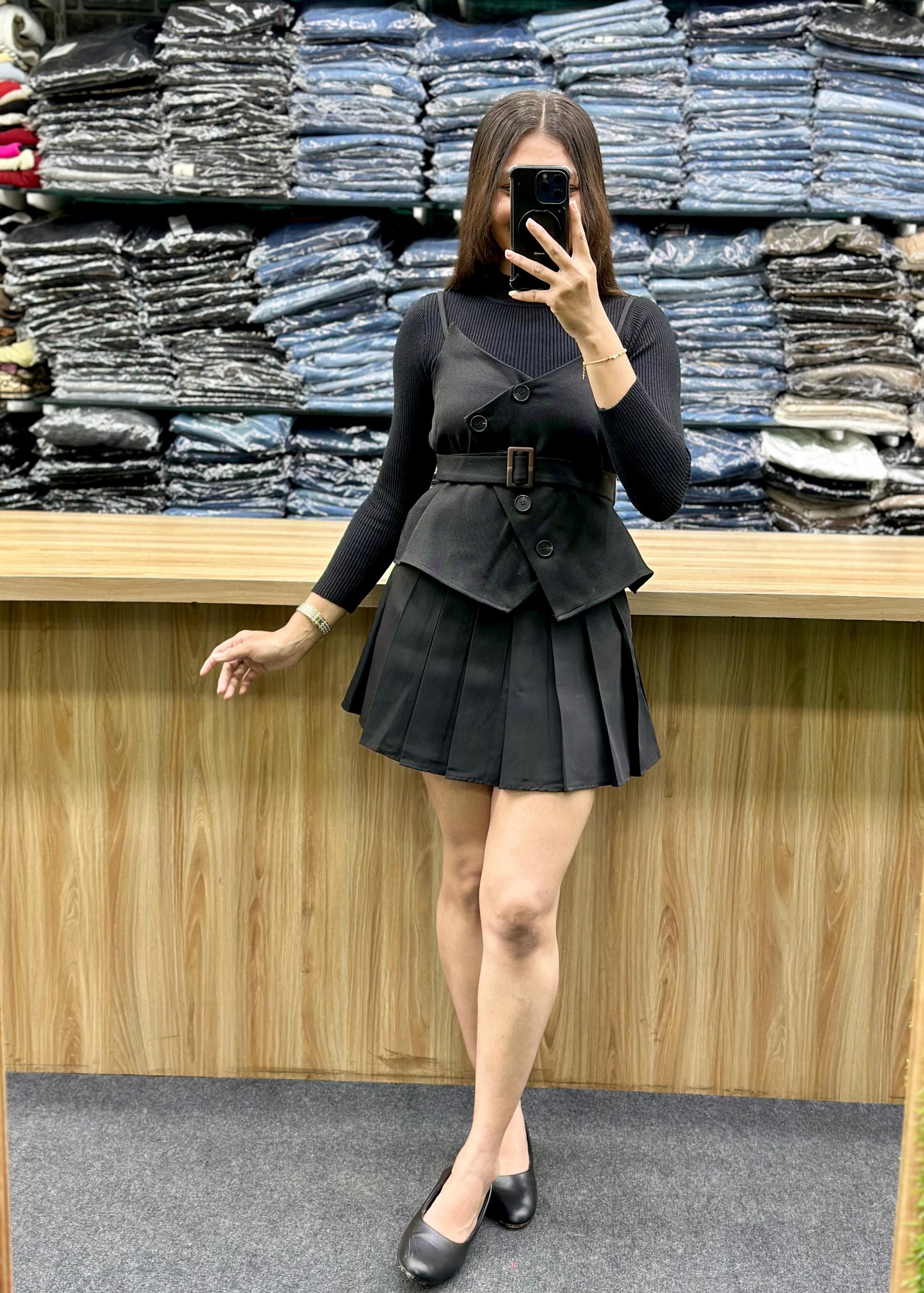 - Layered Top: Worn over the turtleneck is a sleeveless black peplum-style vest or top, featuring a unique, asymmetric button-down design and a belted waist, adding a distinct structural element to the look.
