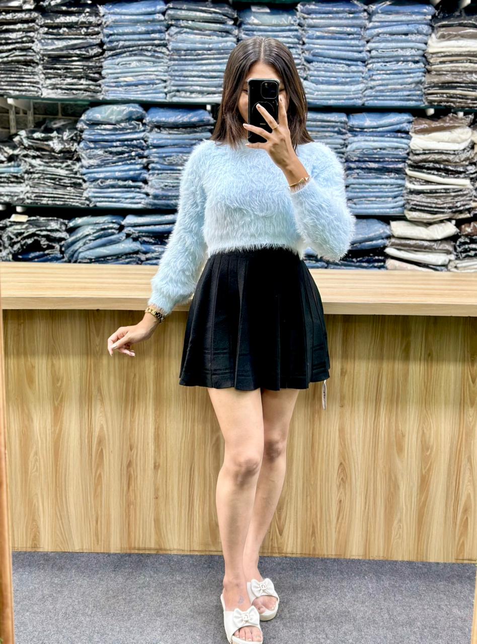 fuzzy light brown sweater paired with a short, pleated, high-waisted skirt featuring a tan and white plaid pattern.
