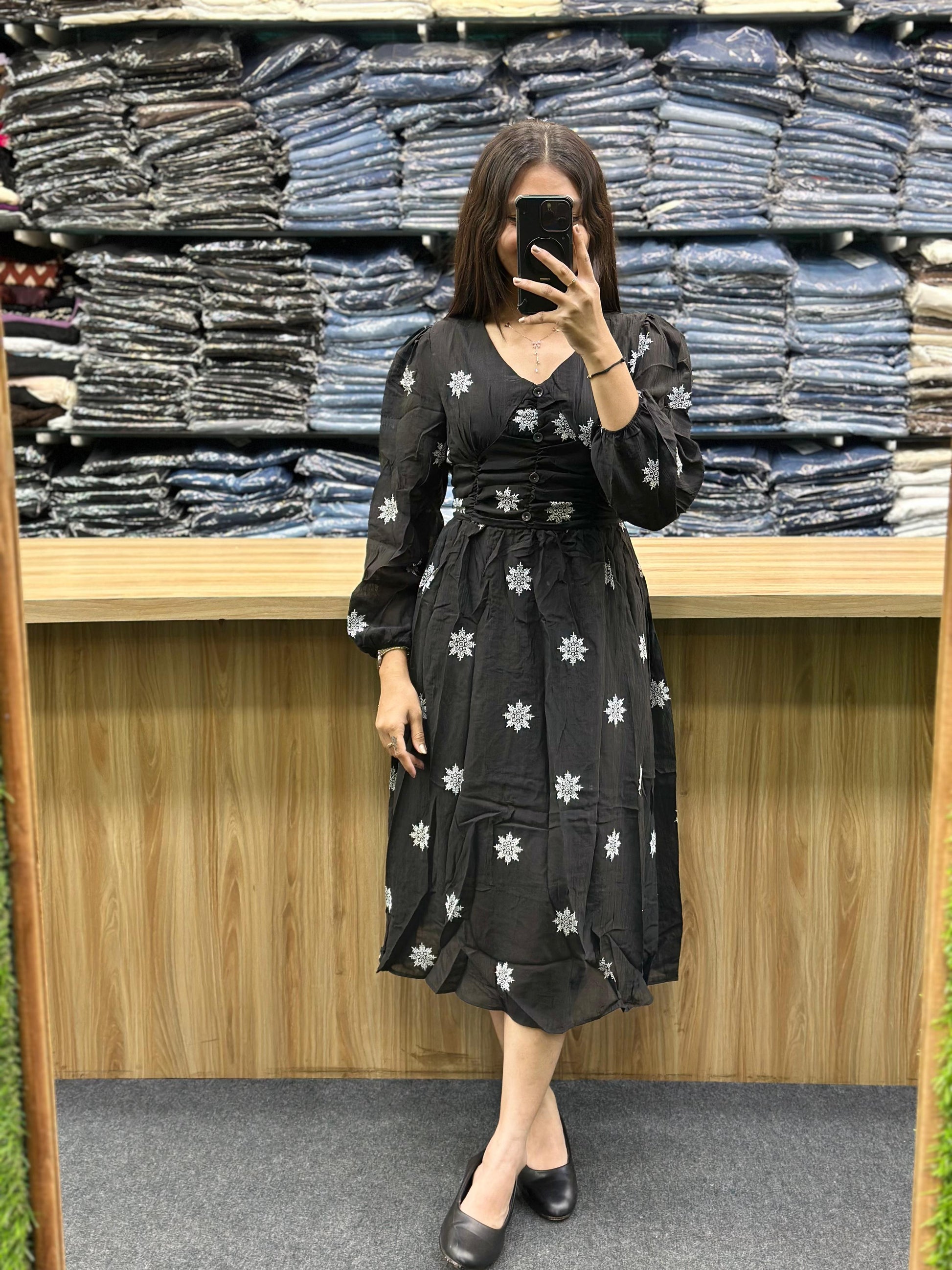 - Silhouette & Length: The dress has a fit-and-flare silhouette, gently expanding from the waist downwards, and a midi length, falling somewhere between the knee and ankle.