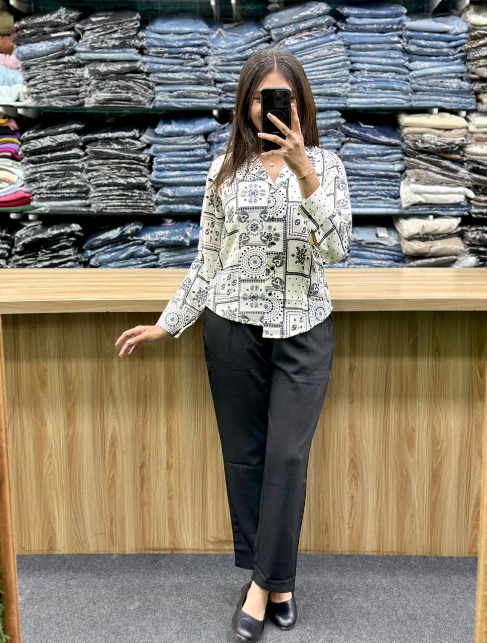 - Top: The blouse is white with an intricate black pattern, potentially a geometric or abstract design, and features a V-neckline.