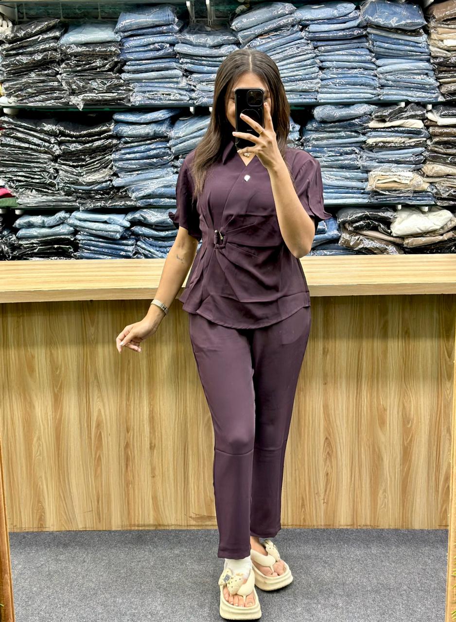 The outfit is a dark color co-ord set, which is a matching top and pants. The top has a V-neckline and short sleeves, with a wrap or belted detail at the waist. The pants are full-length, and the set is described as a casual two-piece outfit. Similar outfits can be found at retailers that sell women's fashion and co-ord sets