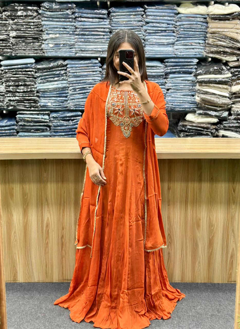 STYLE : LONG TRADITIONAL GOWN WITH EMBROIDERY AND HAND WORK ON CHEST AREA,PLAIN DUPATTA