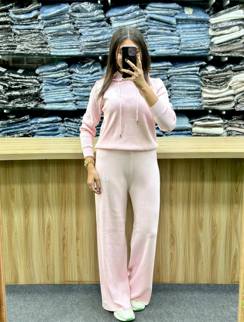 - Overall: The set is a light pastel pink color and appears comfortable and casual. The person is also wearing white flat shoes or slippers.