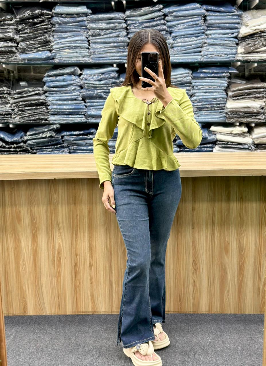 - Sleeves: The top has long, cuffed, or bell sleeves.