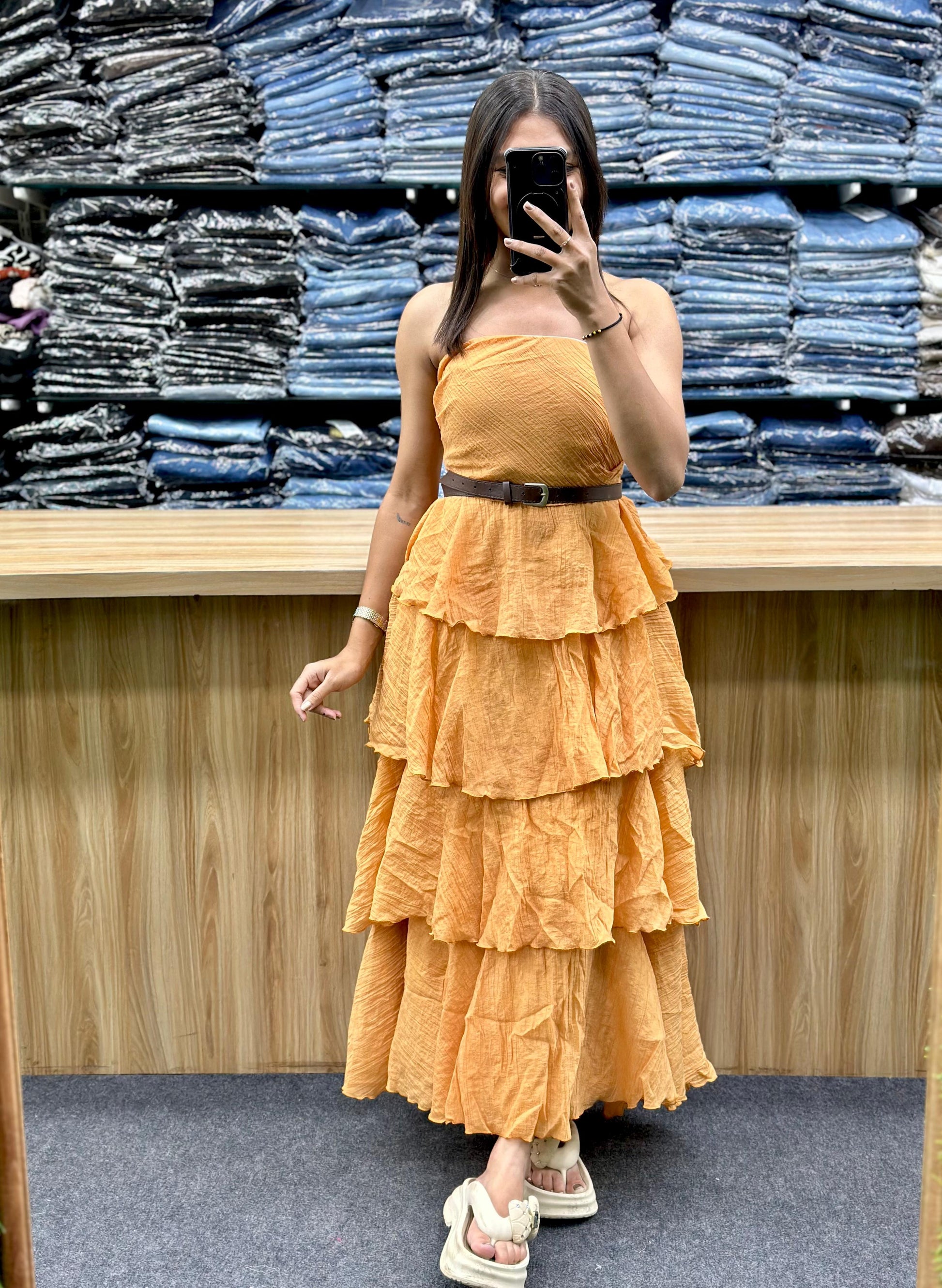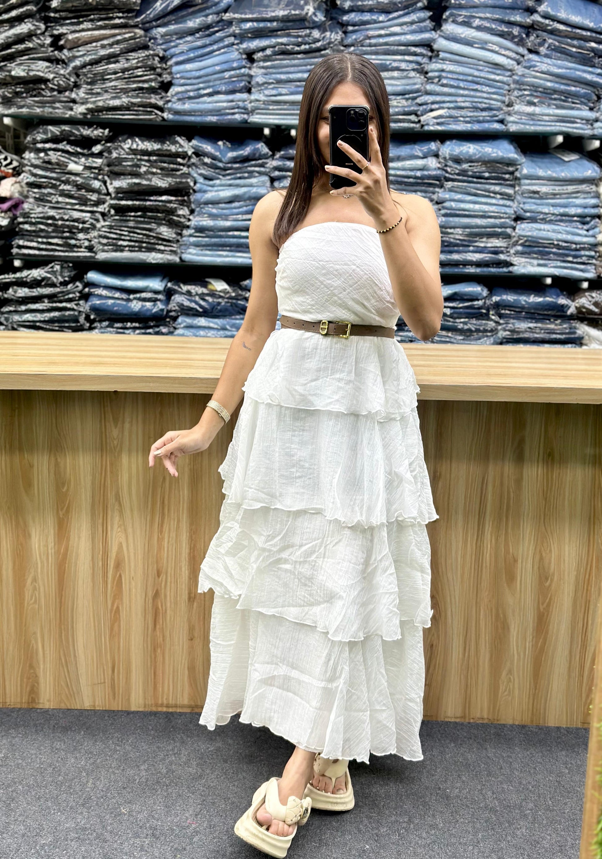 - Silhouette: Tiered, with distinct horizontal layers of fabric creating a cascading, ruffled effect from the bust down to the hem.