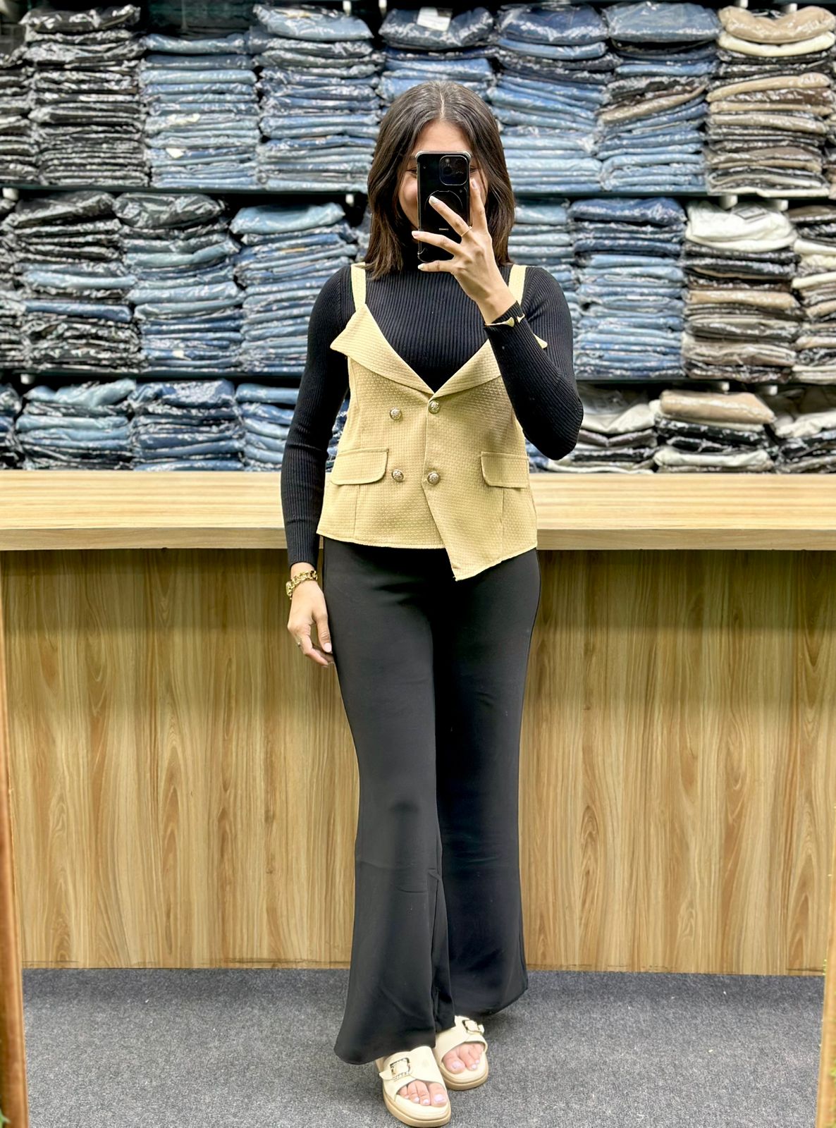 Top: A black, long-sleeve, high-neck top serves as the base layer The outfit is a chic, coordinated ensemble featuring.