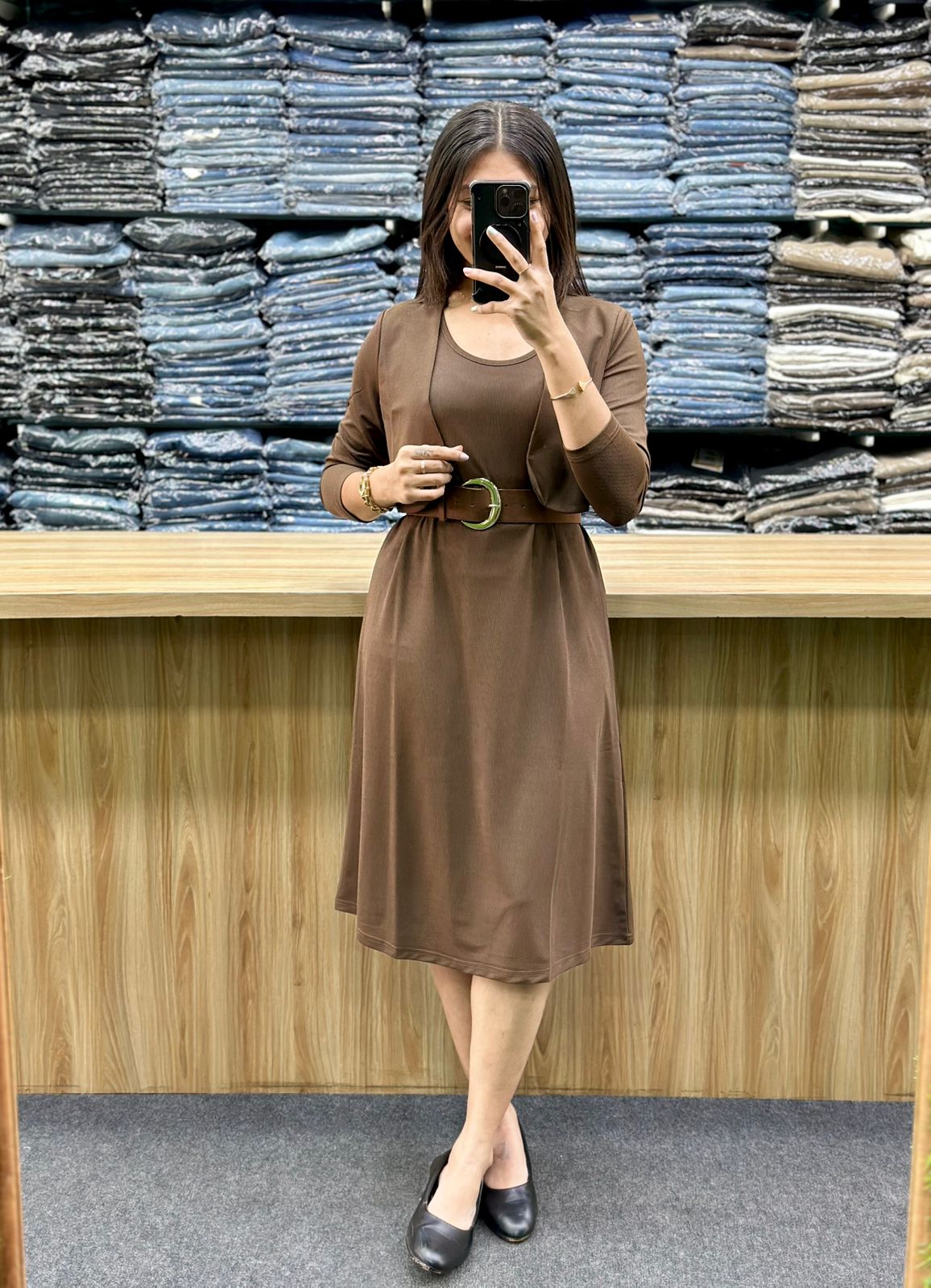 - Accessories: The outfit is cinched at the waist with a broad, matching brown belt featuring a large, round gold-tone buckle, which helps accentuate the figure.