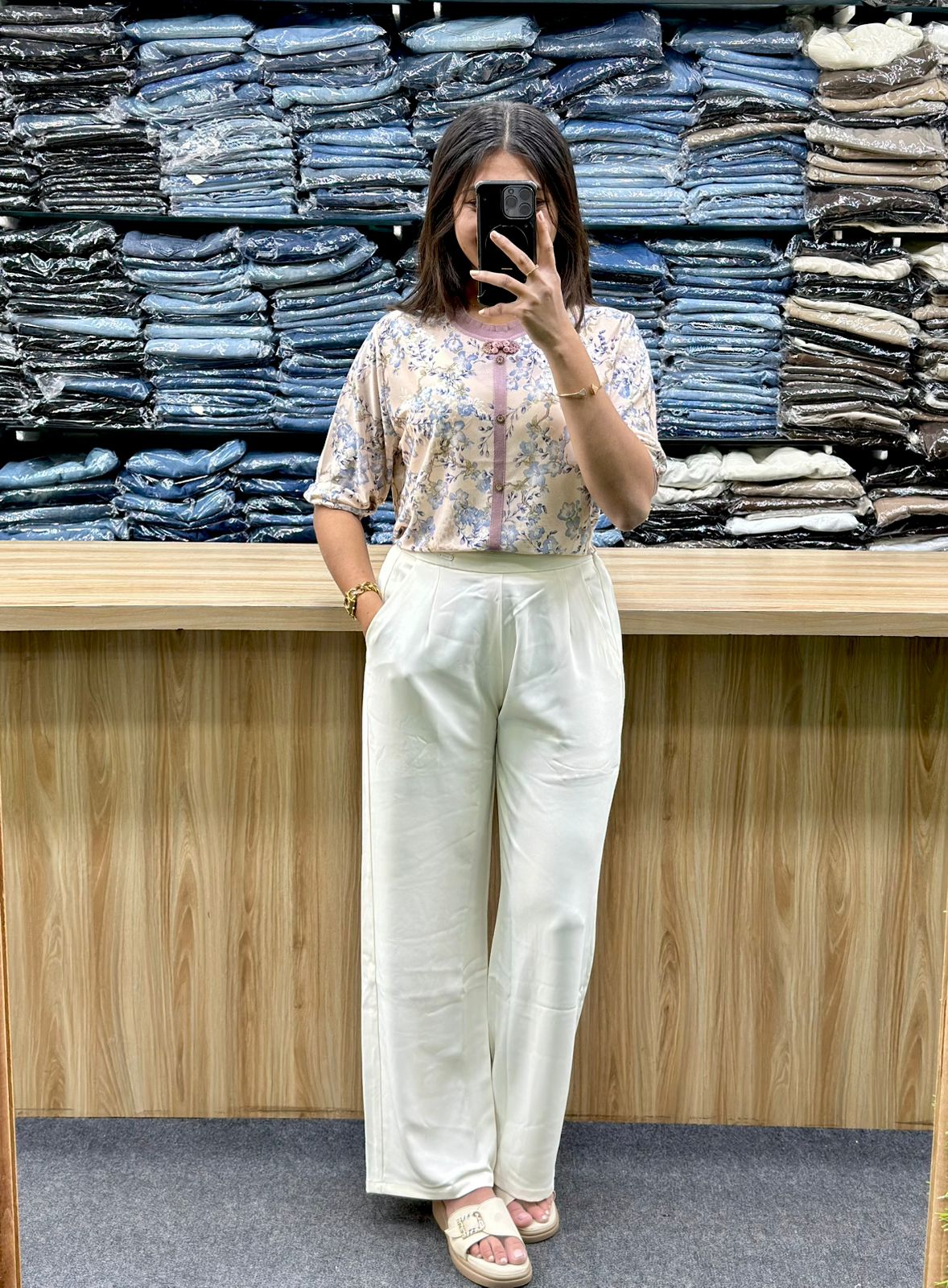 Top: A light-colored floral-print top with short sleeves and a keyhole neckline detail.