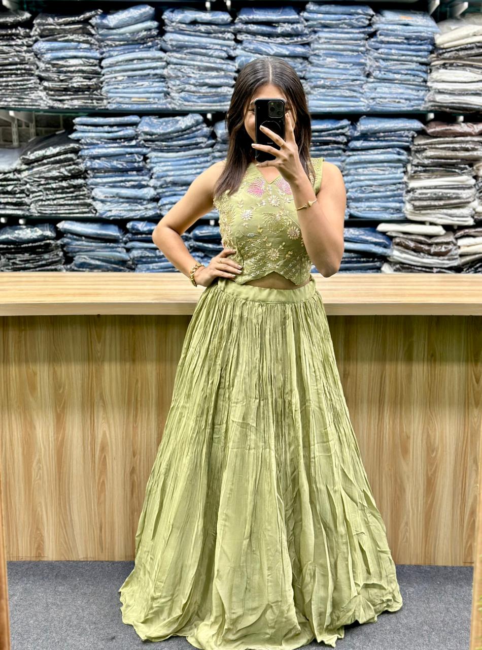 - Skirt (Lehenga): The long, flared skirt is made from a georgette or net-like fabric and features a crushed or ruffled texture, creating volume and movement.